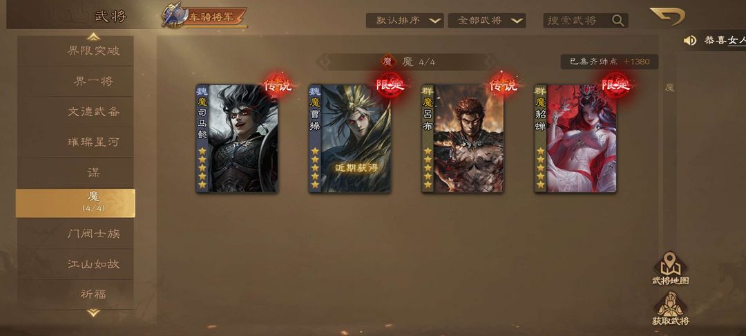 装备描述:475将,1378皮,车骑将军 ⭐14大祈福:谋诸葛亮(绘卷),魔曹操(绘卷)魔貂蝉(绘卷),费祎(绘卷),蒋琬(绘卷),鲍三娘,郭照(绘卷),二曹(动),薛灵芸(动),族钟琰,二袁,龙凤(动),徐荣(动),曹纯 ⭐6翻:祢衡(绘卷),蒲元(绘卷),张华(绘卷),夏侯玄(绘卷),族荀谌,神张角(绘卷) ⭐27台:魔吕布/ 魔司马懿(绘卷)/谋文丑/谋鲁肃(动)/sp刘备(动)/sp曹操/谋董卓(绘卷) /谋袁术/谋孙坚(绘卷)/谋张绣(动)/谋小乔(绘卷)/谋庞统(绘卷)/谋华雄(动)/谋袁绍(动)/谋姜维(绘卷)/谋关羽/谋孔融/闪赵云(绘卷)/胡金定/族钟会(绘卷)/族王允 /族荀攸/孙茹/丁尚涴(绘卷)/界徐盛(绘卷)/界曹冲 ⭐14小祈福:族荀采(动)/族杨修/袁姬/吕伯奢/腾芳兰(动)/荀攸/张芝/陈登(动)/羊祜(动)/刘辩(动)/左芬/花鬘(动)/王荣(绘卷)/芮姬(动) ⭐新增:环淑君,谋卢植,谋公孙瓒 ⭐229五阶。26绘卷皮,37限动,80+传动 【禁止逃跑乱用道具,请素质游戏谢谢】