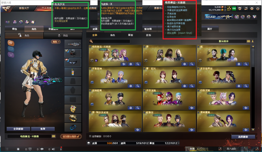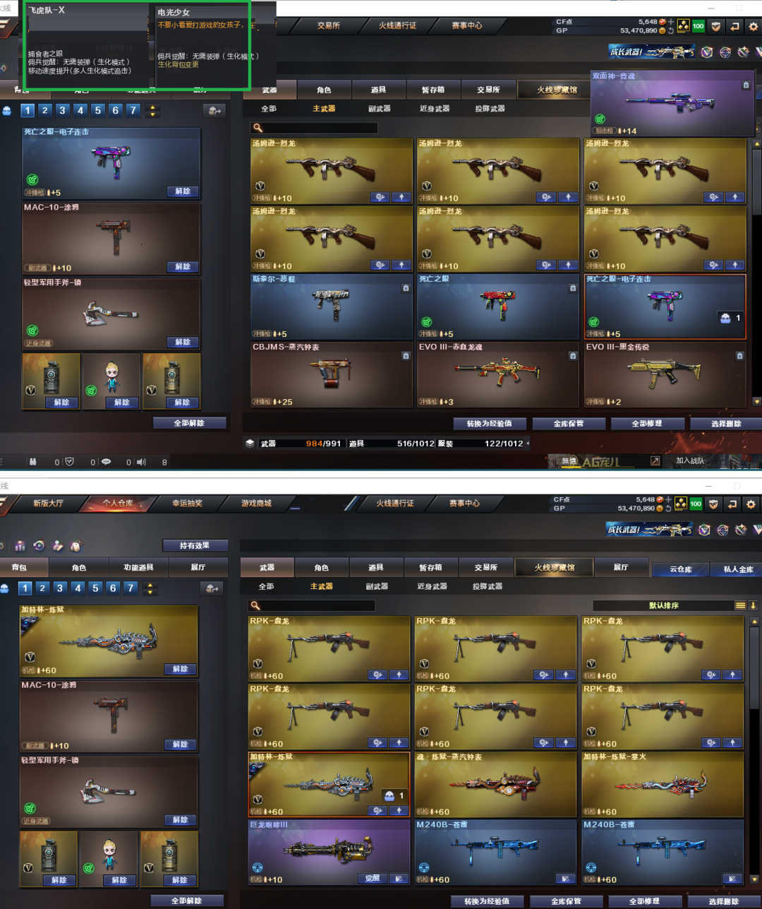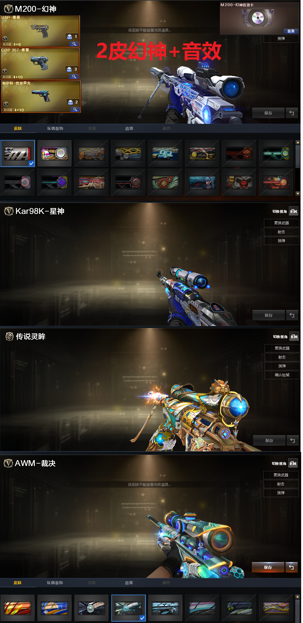 装备描述:排位:可以、、、、、、生化四防:(生化背包、查看僵尸血量)无需换弹、6烈6盘炼狱、死亡之眼、MAC-涂鸦、手斧镜、生化雷、超级对讲机、全部弹匣、、、、、、爆破四防:幻神2皮+音效(星耀、动感闪耀皮肤)98K星神、传说灵眸、M200-竞技荣光、USP雷暴、COP雷霆、柯尔特竞技荣光、白虎、QBZ金色蔷薇、、、幻神音效、毁灭音效、黑骑士音效、、、7套雷霆、1套雷暴、1套夜魔、1套竞技荣光、、、生化四防(蛇隐宗、电光少女、飞虎队)、爆破四防(云悠悠)