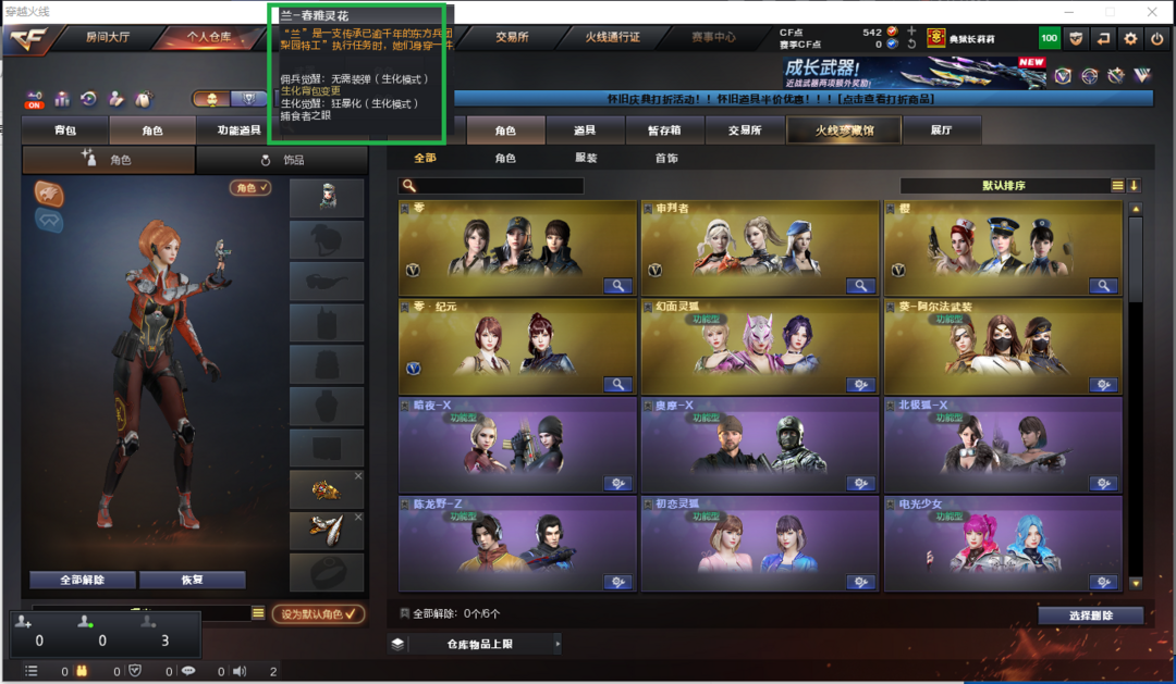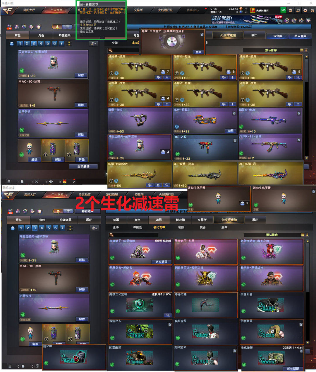 装备描述:排位:可以----------------生化四防全装(生化背包、可以查看生化僵尸血量)无需换弹、6烈、炼狱、VPER-12-宙斯、异变清道夫-小人枪、双面神、炼狱小钢、死亡之眼、MAC-涂鸦、2个生化减速雷、超级对讲机、生化常用弹匣、、、、、、、、、爆破全装:98K星神-长生圣莲、玄豹左轮、王者凌虎、、、炼狱音效、、、生化四防(兰-春雅灵花)