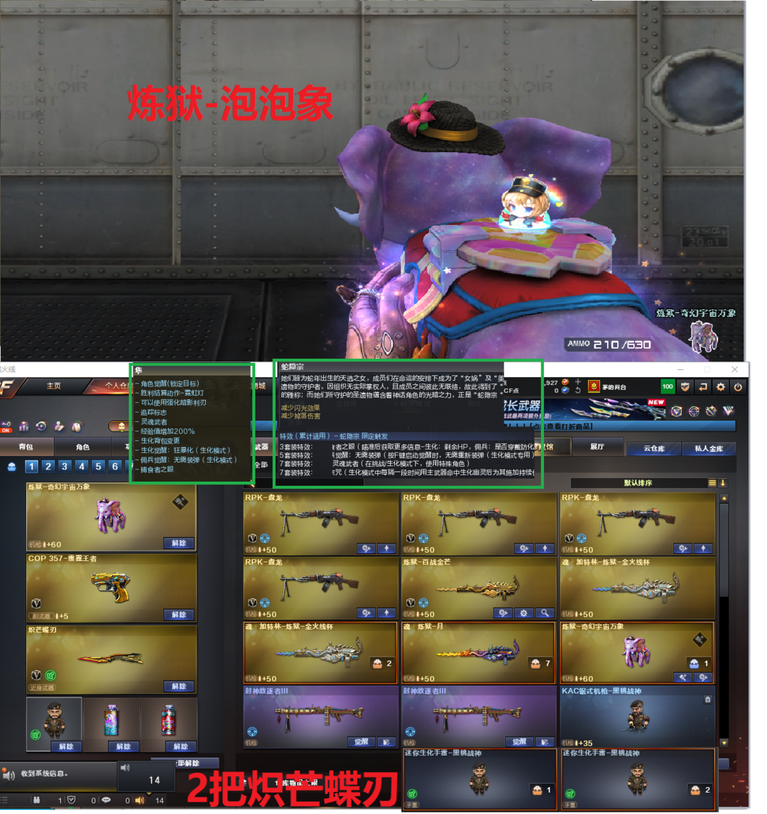 装备描述:排位:可以、、、、、生化装备(变更背包、看僵尸血量):无需换弹、4盘龙、炼狱、炼狱泡泡象、死亡之有、炽芒蝶刃、超级对讲机、、、、、、爆破四防:幻神2皮(24AG冠军、电流骇客皮肤)、COP雷霆王者、柯尔特-无冕之王、、、、G36幻影、QBZ金色蔷薇、炽芒蝶刃、、、裁决音效、、、1套云龙、1套雷霆王者、、、生化人物(隼)