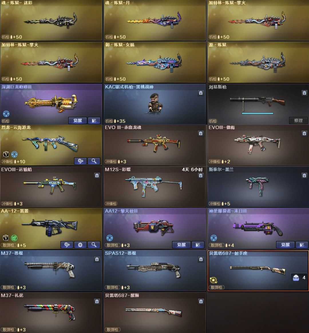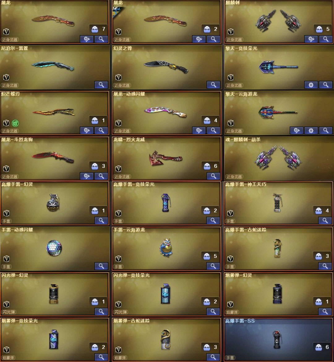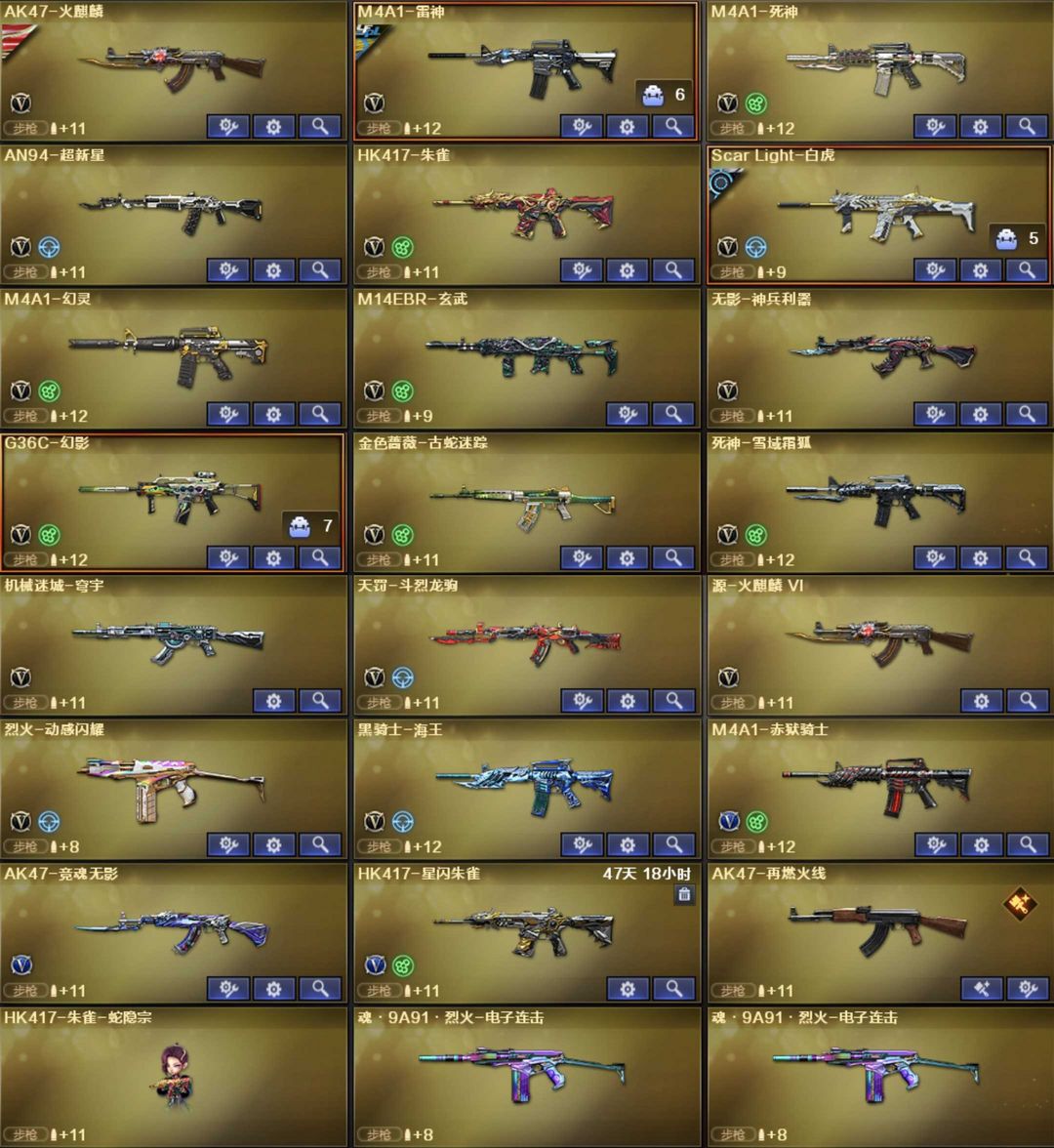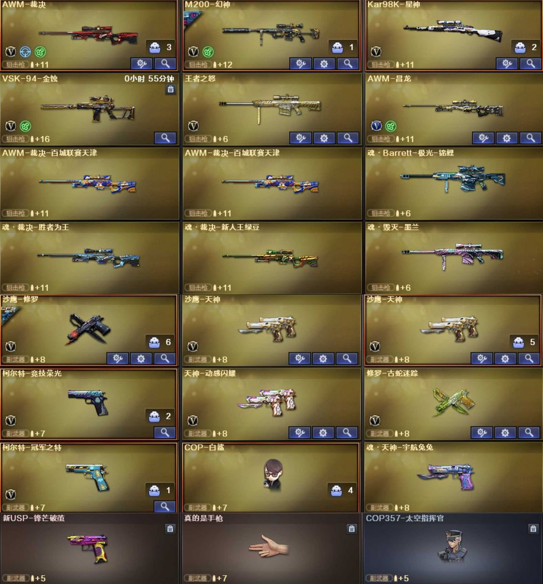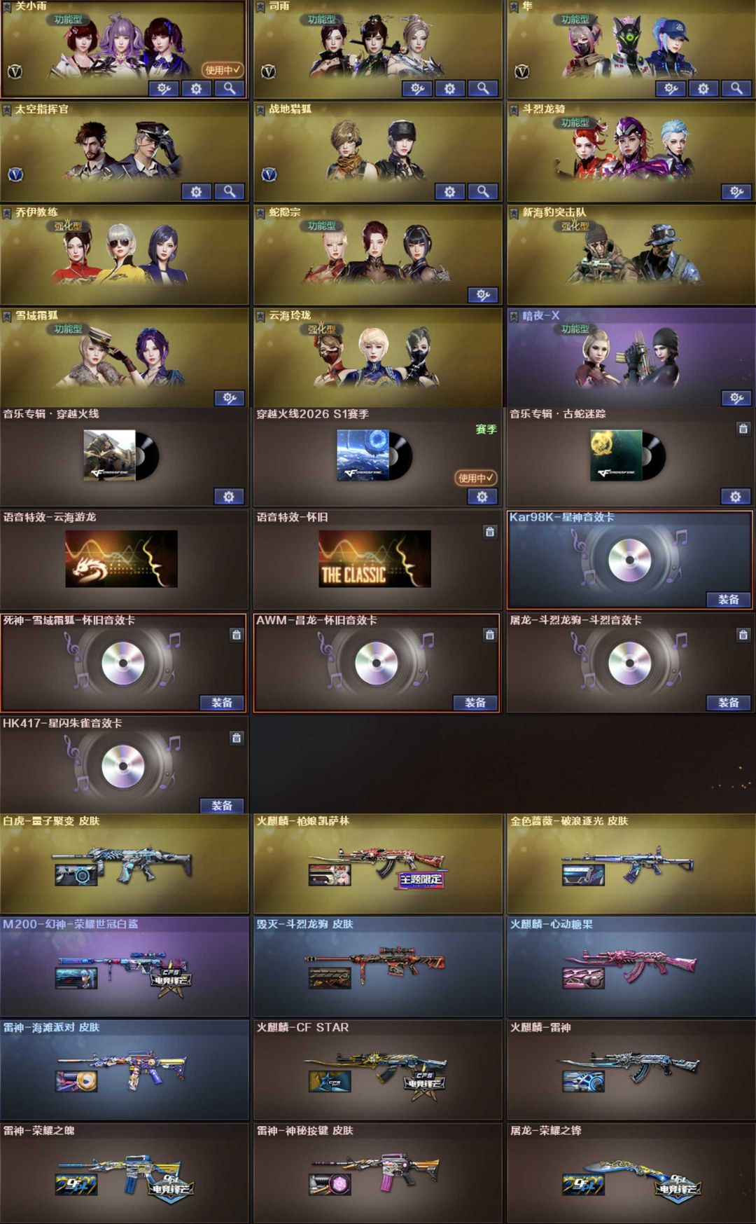 装备描述:狙:幻神,裁决,星神,AWM昌龙,王者之怒,VSK金蚀。 步枪:G36C幻影,白虎,朱雀,玄武,幻灵,蔷薇古蛇迷踪,死神雪域霜狐,机械迷城穹宇,天罚斗烈龙驹,无影神兵,超新星,雷神。 副武器:修罗沙鹰,沙鹰天神,柯尔特竞技荣光,柯尔特冠军之特,cop白鲨,修罗古蛇迷踪,天神动感闪耀。 近身武器:炽芒蝶刃,幻灵之锋,屠龙,尼泊尔雷霆,屠龙斗烈龙驹,屠龙动感闪耀,麒麟刺,擎天竞技荣光擎天云龙游海。 投掷:竞技荣光雷套,幻灵雷套。 角色:关小雨,司雨,隼, 太空指挥官,战地猎狐,斗烈龙驹,乔伊教练,蛇隐踪,新海报突击队,雪域霜狐,云海玲珑。 死神雪域霜狐音效卡,AWM昌龙音效卡,星闪朱雀音效卡。 皮肤,幻神荣耀世冠白鲨,白虎量子聚变,蔷薇逐风破浪,火麒麟凯特琳,雷神海涛派对