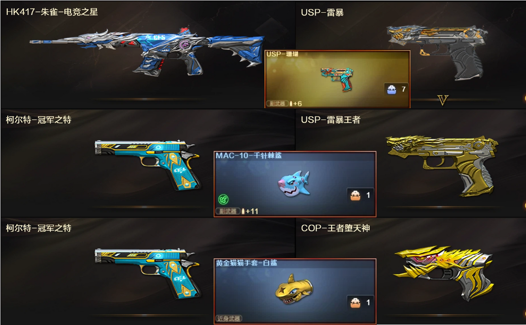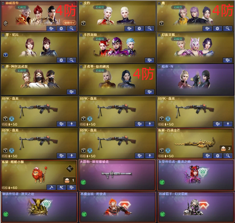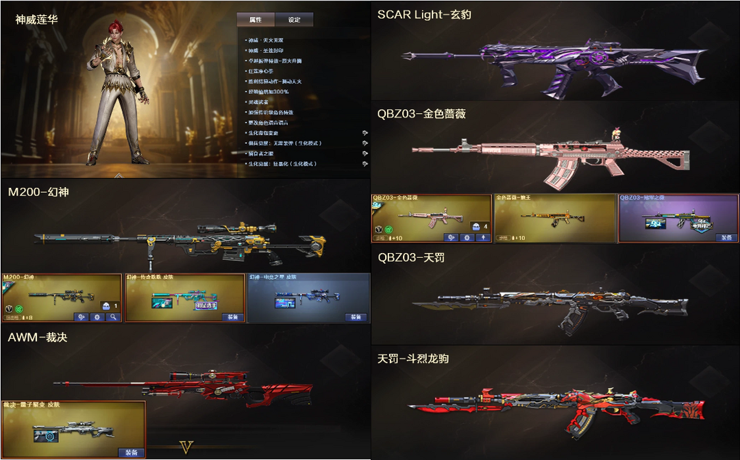 4防神威莲华+红狮炼狱5盘龙♉幻神欧欧电竞+裁决量子✅白虎玄豹QBZ蔷薇+天罚朱雀6满副鲨臂♉4防鹰
