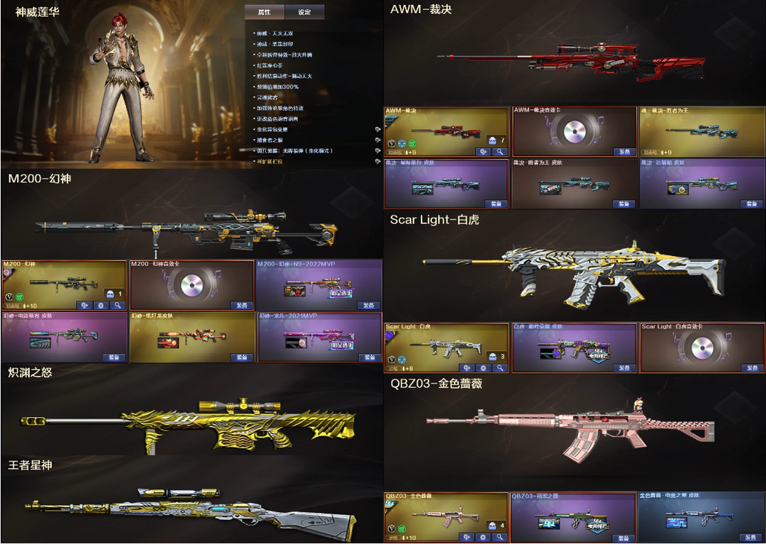 神威莲华+3炼狱4盘龙✅幻神4皮宠儿念旧音效+裁决3皮音效+星神✅白虎三件套QBZ蔷薇+7满副炽芒