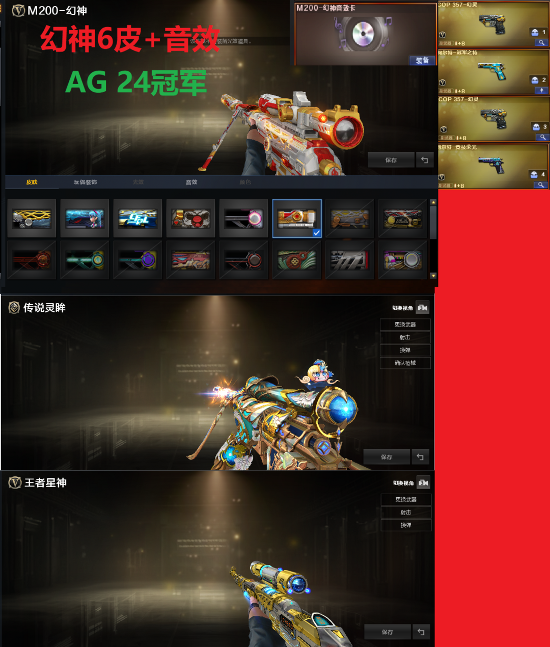 装备描述:排位:可以、、、、、、、、、、、爆破四防:幻神音效(24AG冠军、宠儿、N9、冠军之幻、周瑜、白鲨)、王者星神、2个COP幻灵、冠军之特、柯尔特竞技荣光、传说灵眸、白虎、QBZ金色蔷薇、玄武、王者芳薇、炽芒蝶刃、、、幻神音效、毁灭音效、黑骑士音效、、、6套幻灵、2套竞技荣光、1套神工天巧、1套雷霆王者、、、爆破四防(关小雨、王者潘多拉、影豹、职业经理)