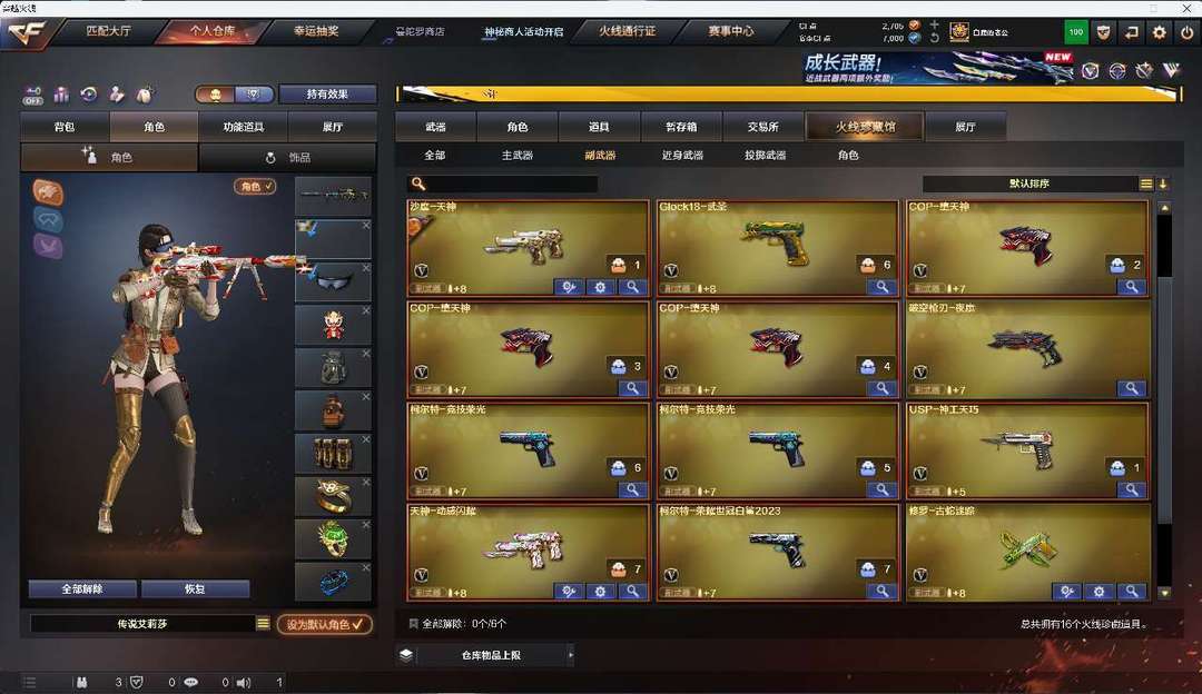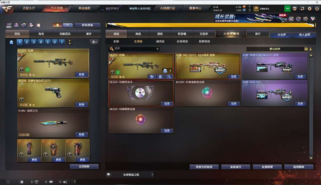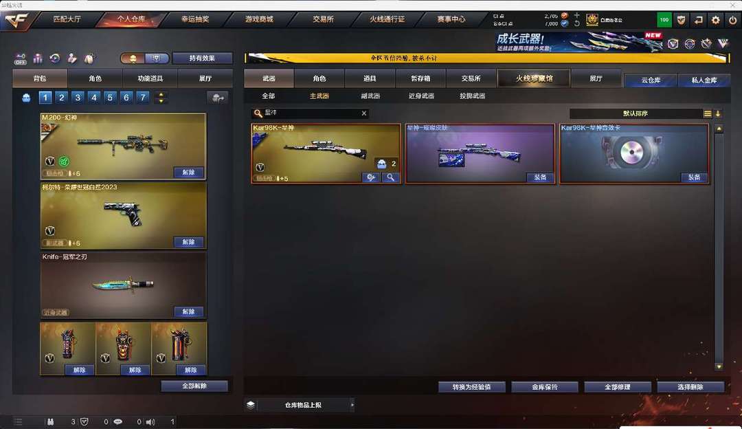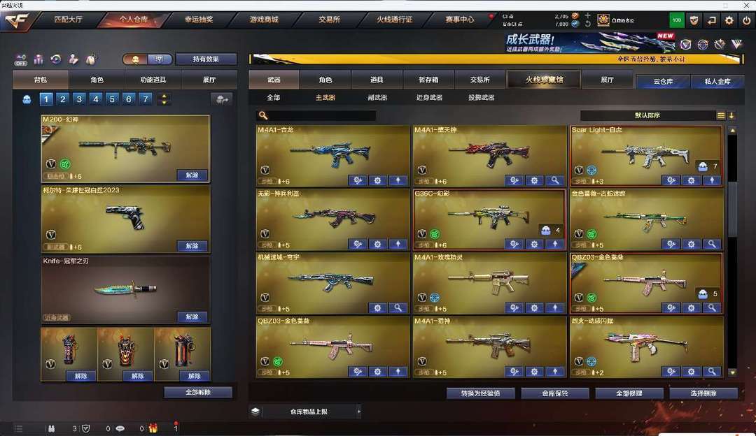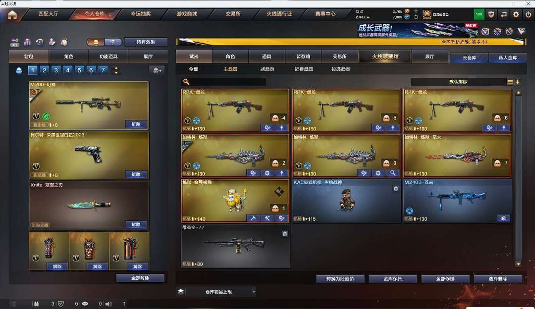 装备描述:英雄武器137个; 王者武器15个。 AN94-超新星、M4A1-黑骑士、M4A1-玫瑰精灵、AK47-黑武士、麒麟刺、AK47-火麒麟、AK47-麒麟、AWM-天龙、Barrett-毁灭、加特林-炼狱、M4A1-雷神、M4A1-黑龙、QBZ03-金色蔷薇、AK-47-雷神、AA-12-雷霆、M4A1-堕天神、COP-堕天神、龙啸-堕天神、麒麟刺-堕天神、闪光弹-堕天神、烟雾弹-堕天神、破空枪刃-夜魔、M4A1-青龙、Kar98K-星神、M200-幻神、雷霆之锋、黑骑士-海王、M200-竞技荣光、幻灵之锋、擎天-竞技荣光、柯尔特-竞技荣光、烟雾弹-竞技荣光、闪光弹-竞技荣光、高爆手雷-竞技荣光、USP-神工天巧、传说灵眸、火麒麟-AG、柯尔特-荣耀世冠白鲨2023、传说圣谕、王者之幻、王者之势、王者之魄、王者之怒、王者之光、王者之心-觉醒版、王者之锋-觉醒版、王者白虎-觉醒版、王者冰锋、雷霆-β、生化弹匣、Barrett-毁灭音效卡、M4A1-雷神音效卡、AK47-火麒麟音效卡、M4A1-黑骑士音效卡、M200-幻神音效卡、Kar98K-星神音效卡、加特林-炼狱音效卡等,随意畅选。