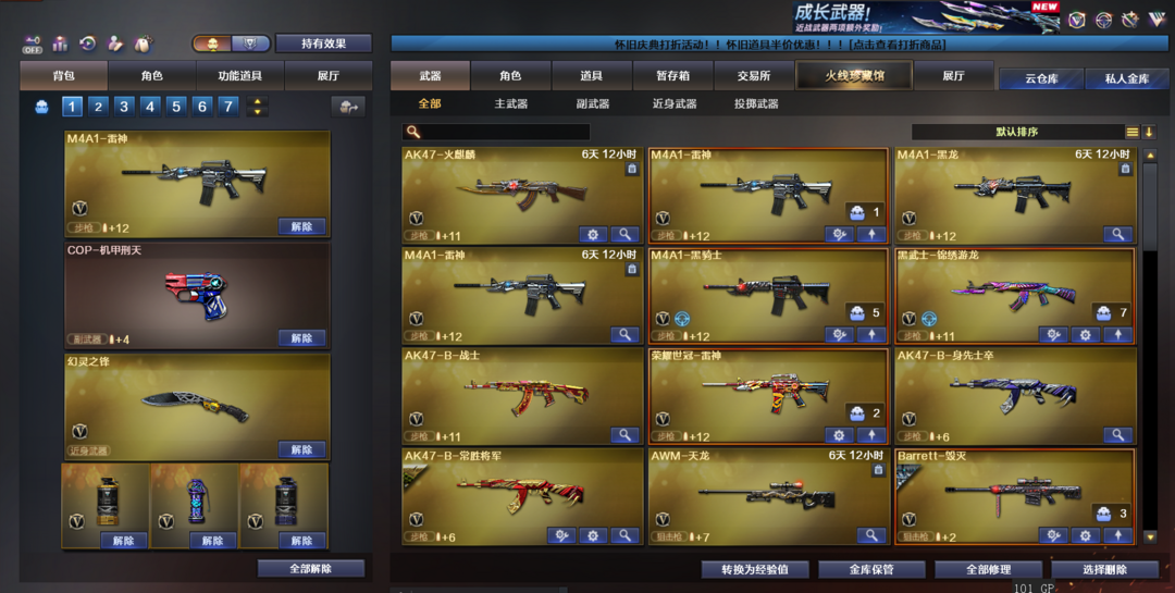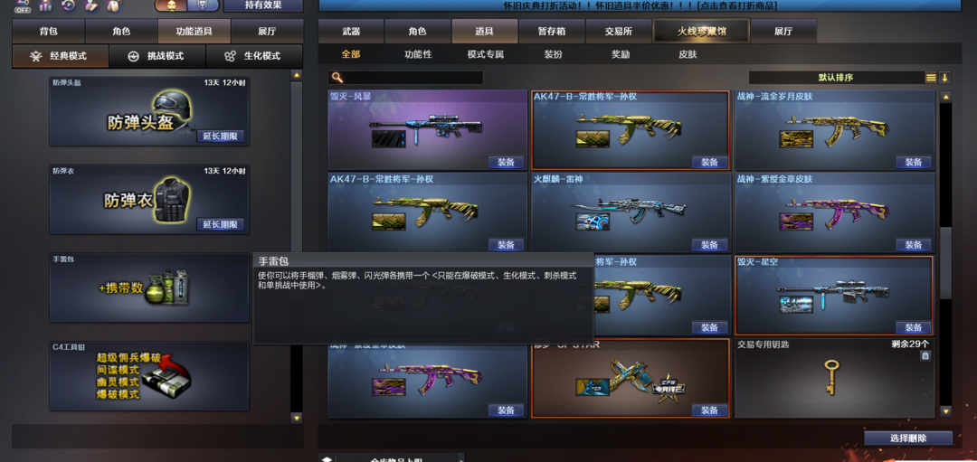 装备描述::潘多拉;堕天使;灵狐者;剑齿虎;暗夜-X;陈龙野-Z;夜玫瑰-X;麻雀;圣诞潘多拉-X;社长刀锋;风暴女;芳心审判者 道具:绿色巨人;妖姬;生化弹匣;闪光护目镜;烟雾保护头盔;防弹头盔;C4工具钳;手雷包;防弹衣;疯狂宝贝;防化服;夺命之镰;防化服;超级背包;天使之翼;M4A1-黑骑士音效卡;M4A1-黑骑士音效卡;超级背包