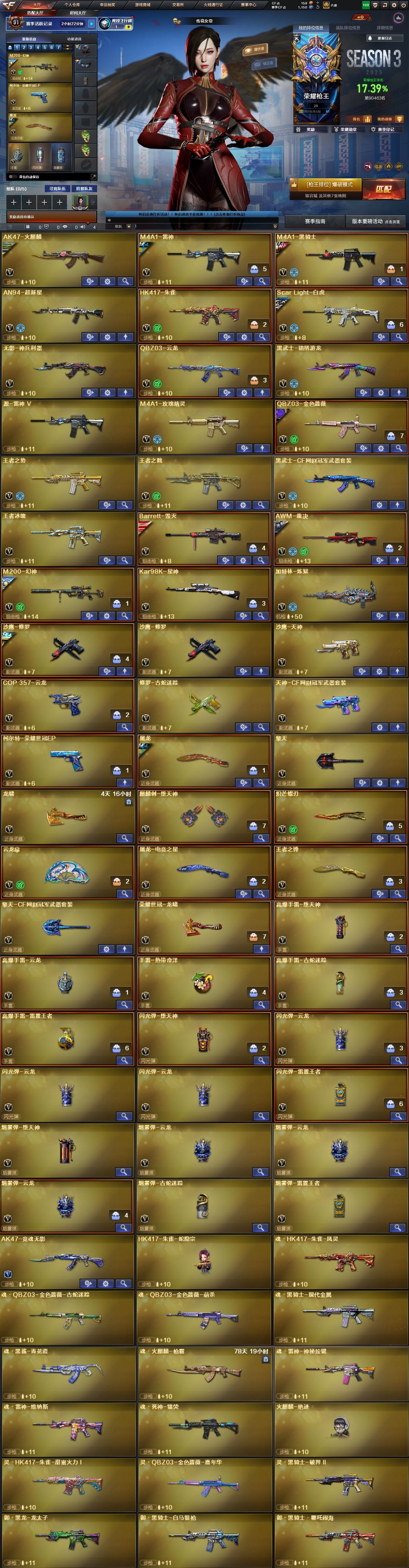 装备描述:【传说女帝+幻神三件套】【m200幻神+荣耀世冠ep皮肤+冠军之幻皮肤+周瑜皮肤+音效卡三件套】【98k星神】【scar白虎+白鲨cfpls23冠军皮肤+AGcfpls20冠军皮肤】【qbz金色蔷薇+巅峰荣耀皮肤】【裁决+胜者为王皮肤】【毁灭枪娘皮肤+音效卡三件套】【火麒麟+战神关羽皮肤+音效卡三件套】【炽芒蝶刃】【柯尔特荣耀世冠ep】【麒麟刺堕天神】【荣耀世冠龙啸】【觉醒王者冰魄/觉醒王者之戮/觉醒王者之势/觉醒王者之锋】【火麒麟/雷神/黑骑士/超新星/hk朱雀/无影神兵利器/qbz云龙/黑武士锦绣游龙/m4玫瑰精灵/黑武士CF网剧冠军/炼狱】【修罗x2/天神/cop云龙/修罗古蛇迷踪/天神网剧冠军】【屠龙/擎天/云龙扇/电竞之星/网剧冠军擎天】【堕天神手雷包/雷霆王者手雷包/云龙手雷包】【传说女帝/新海豹突击队/王者春/王者涂鸦/幻面灵狐/蛇隐宗/奇洋探员/战地猎狐】【樱青春偶像/樱战斗天使/雪莉杨摸金校尉/潘多拉甜心教官/萌力突击/灵狐者黄金海岸/零热舞青春/初恋灵狐】