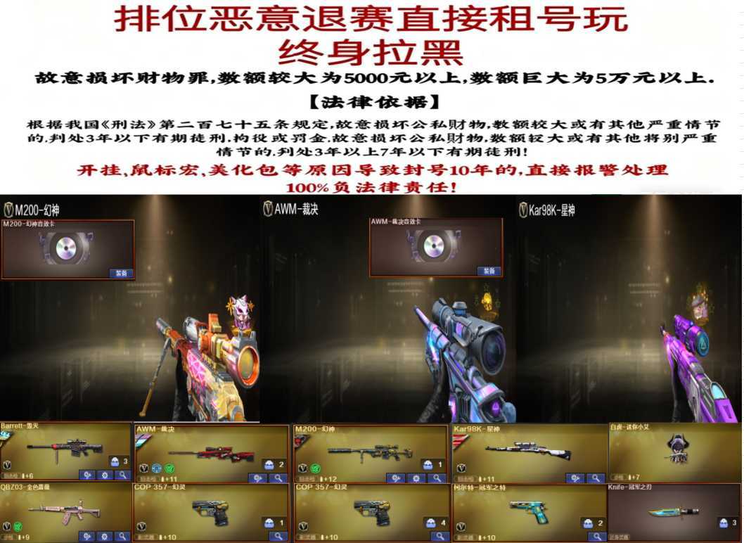 限制: 租号1次及以上 | 撤单率<90%才可租用此帐号装备描述:此号已在当地派出所备案,如有开挂科技选手,必找平台索要租客信息,找团队律师控告到底!
