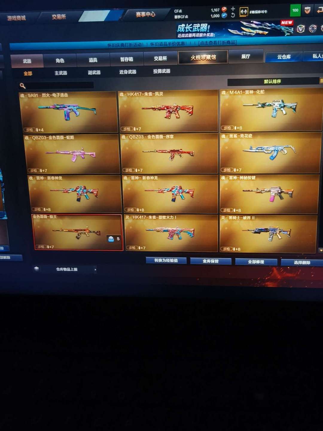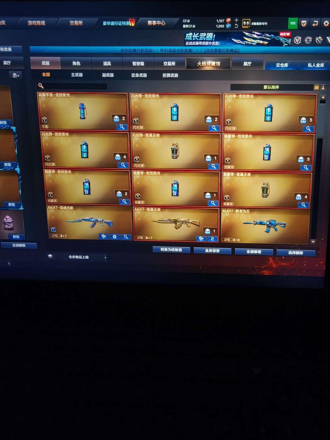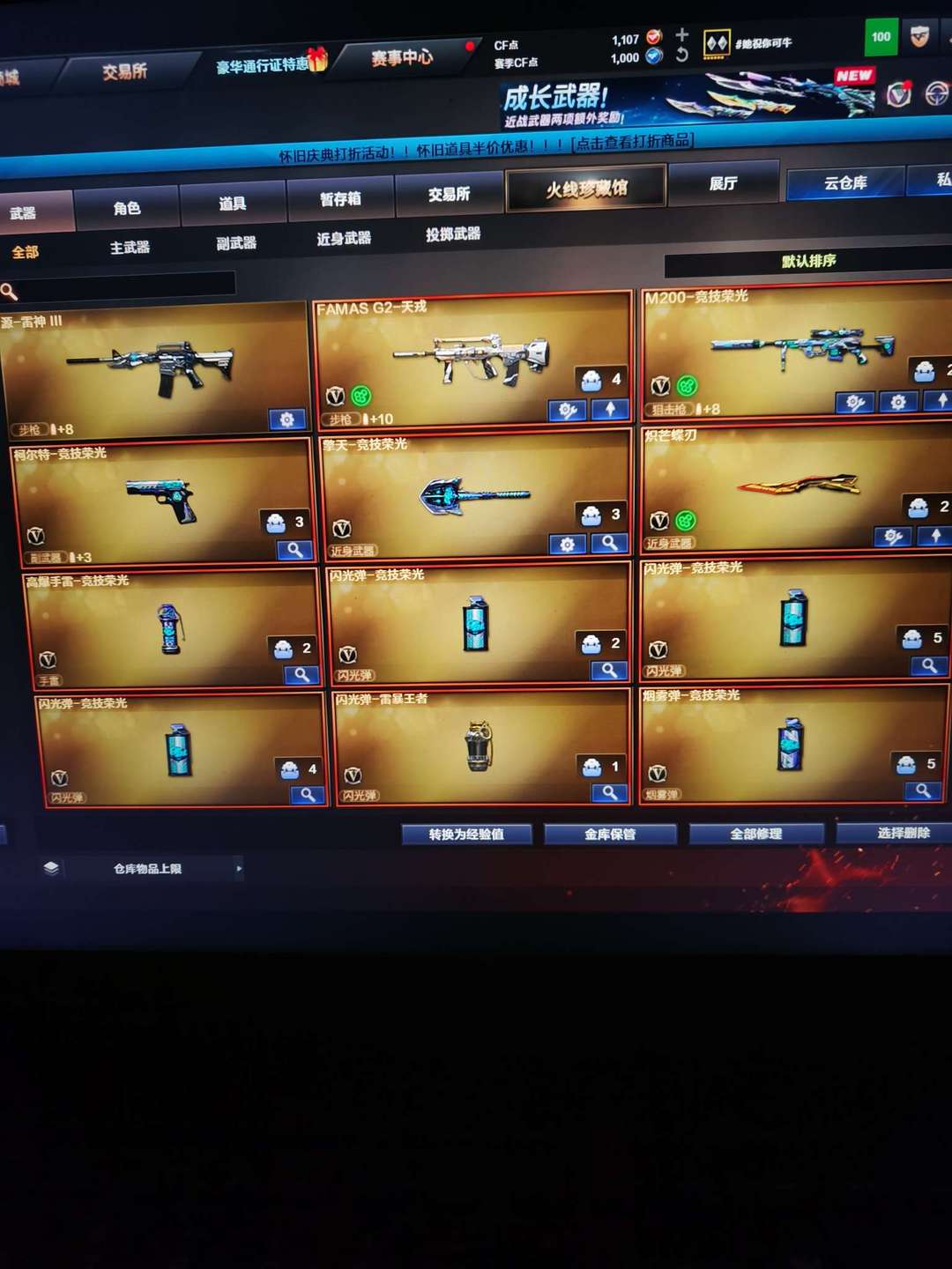 雷 竞技荣光全套 FAMAS天戎炽芒蝶 AK47雷暴王 QBZ金色蔷薇投掷雷暴王者等众多稀有武器