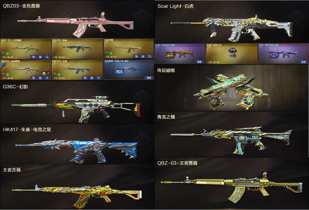 传说破晓☎幻神+裁决羽挚+王者星霆☎QBZ蔷薇电竞芳薇+白虎百战霓虹小艾+幻影朱雀COP☎4防关小雨