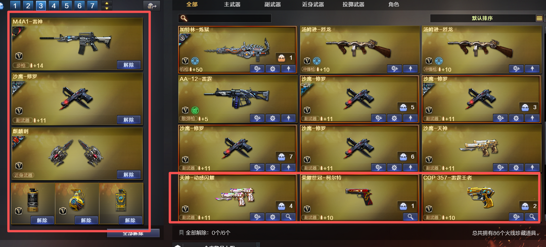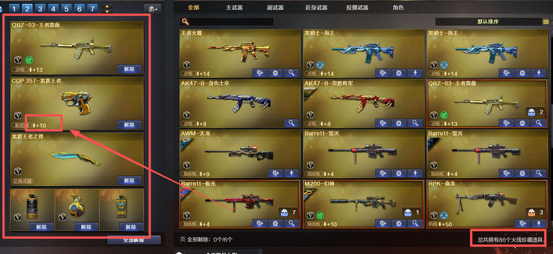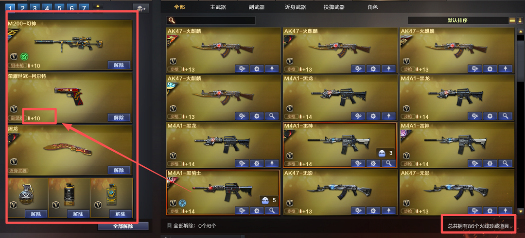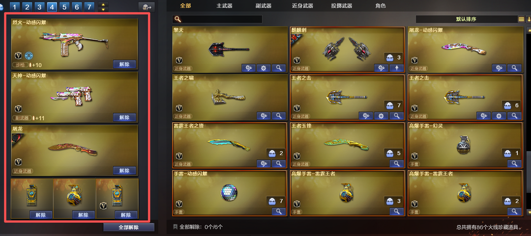 装备描述:北部⭐86V⭐幻神周瑜带卡+世冠柯尔特+14发王者COP+屠龙AG⭐王者蔷薇玉锋⭐4防王者魅影⭐生化