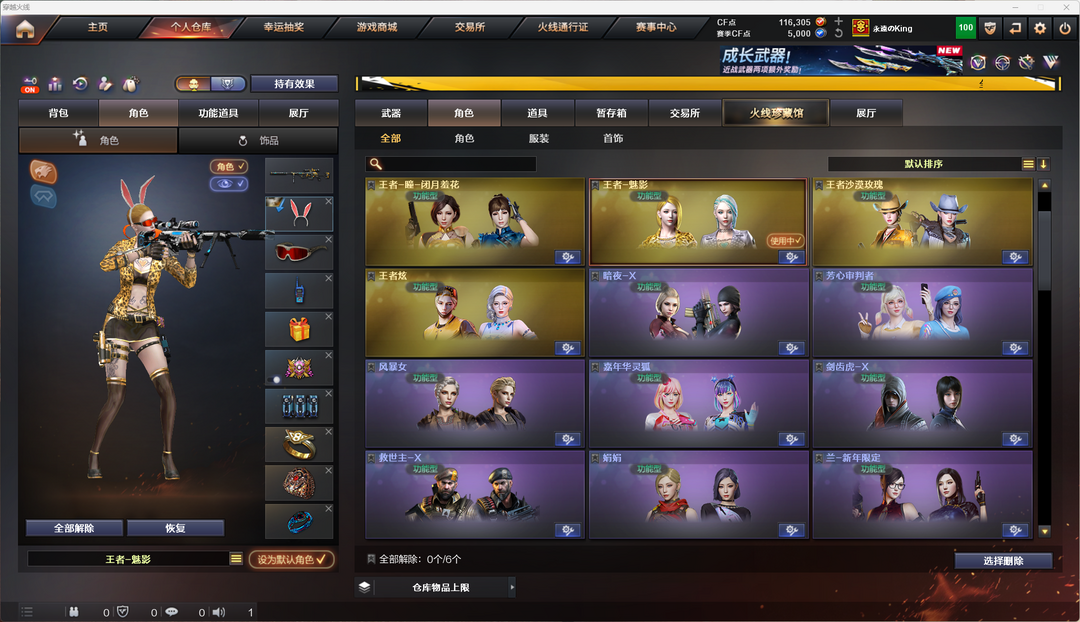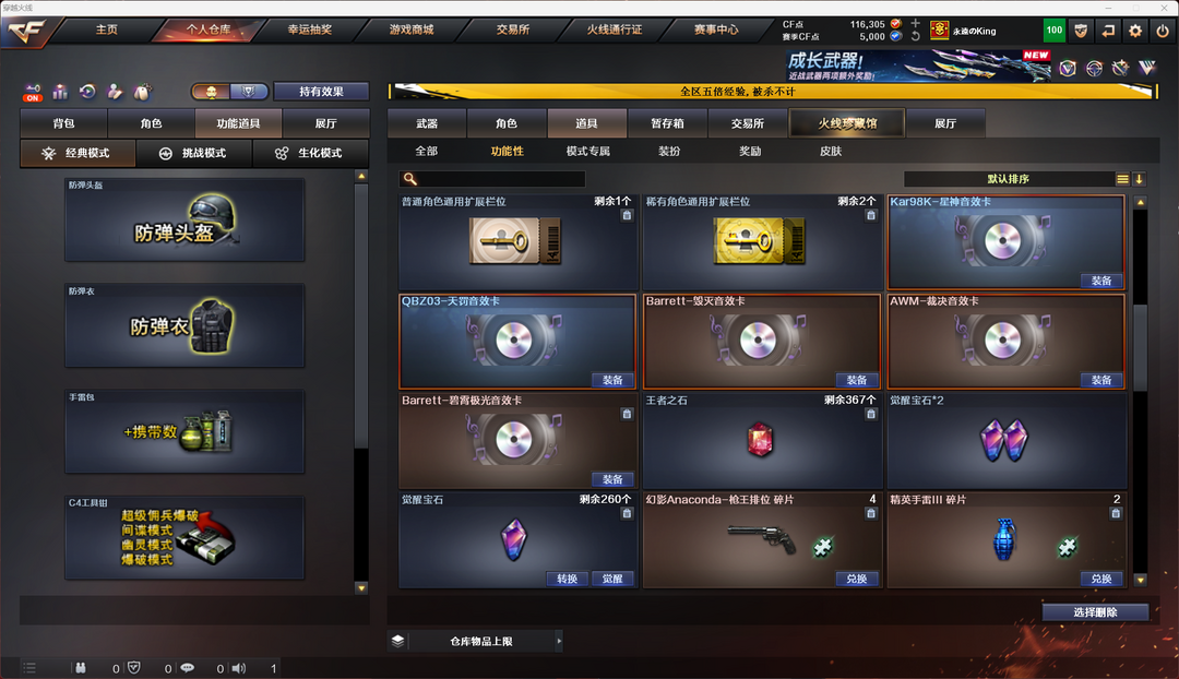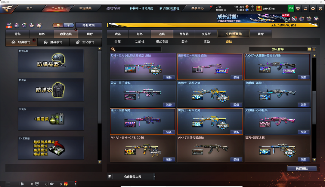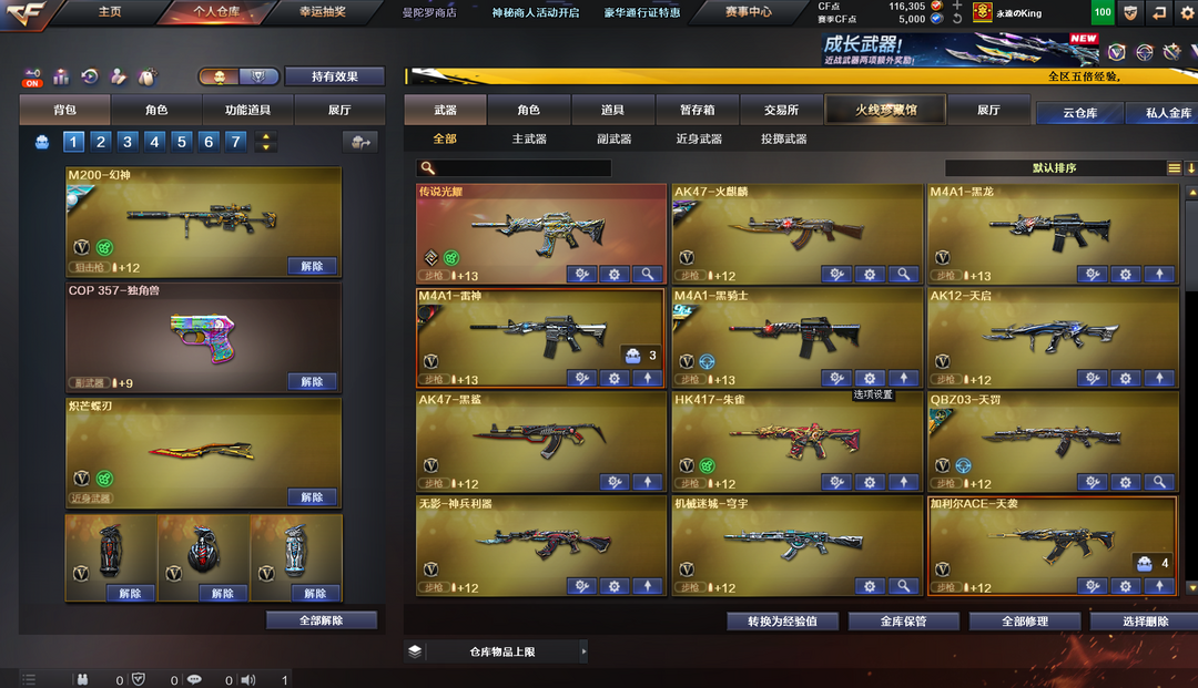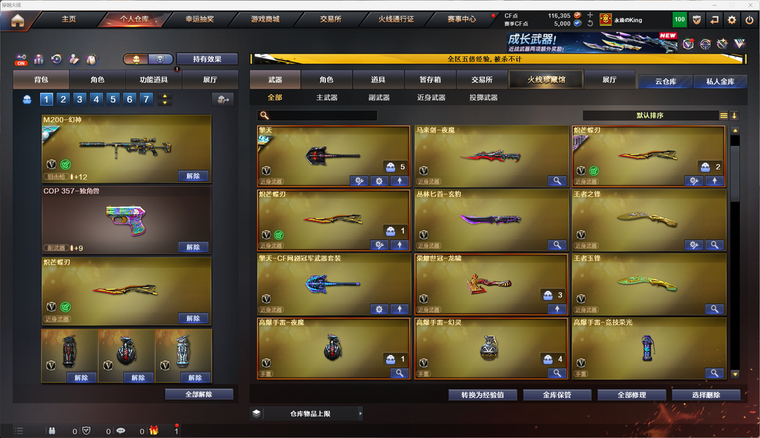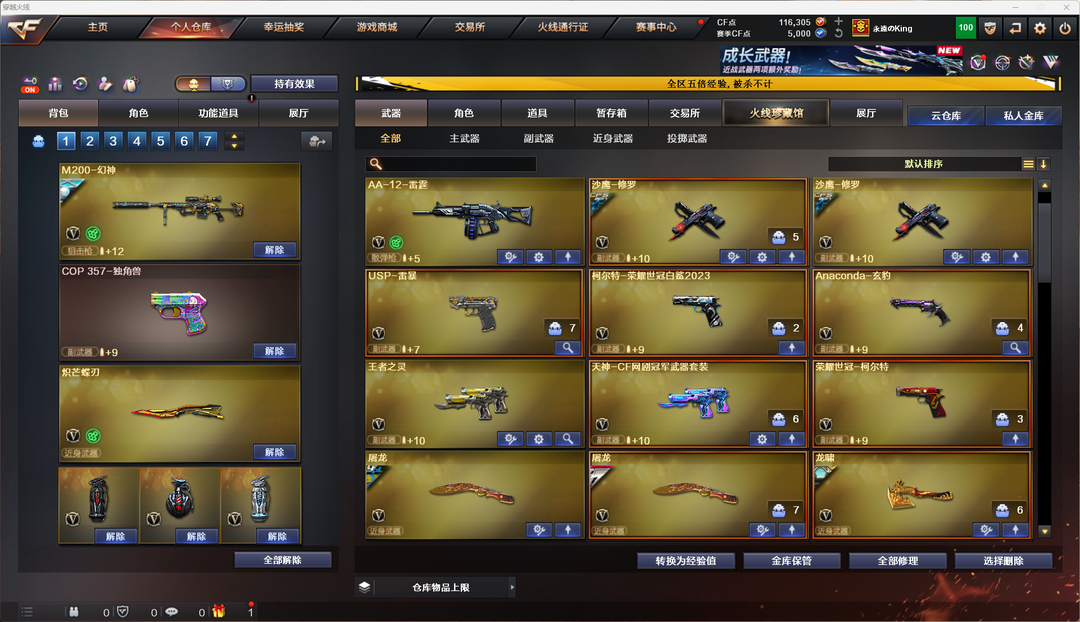 装备描述:王者武器:高爆手雷-王者堕天神;炼狱-悦蓝-觉醒版;王者之心-觉醒版;炫金黑龙;高爆手雷-雷霆王者;烟雾弹-雷霆王者-觉醒版;闪光弹-雷霆王者-觉醒版;M4A1-雷霆王者-觉醒版;雷霆王者之锋;王者之魄高爆手雷;王者之魄闪光弹;王者之魄烟雾弹;王者之灵-觉醒版;王者之锋-觉醒版;王者玉锋;王者白虎-觉醒版;王者幻神-觉醒版;王者之魄-觉醒版 英雄武器:Barrett-毁灭;炽芒蝶刃;加利尔ACE-天袭;烟雾弹-玄豹;闪光弹-玄豹;Anaconda-玄豹;丛林匕首-玄豹;M4A1-黑龙;机械迷城-穹宇;柯尔特-荣耀世冠白鲨2023;屠龙;M200-幻神;Barrett-毁灭;Kar98K-星神;AK12-天启;AK47-黑鲨;QBZ03-天罚;汤姆逊-烈龙;RPK-盘龙;QBZ03-金色蔷薇;Barrett-极光;高爆手雷-幻灵;闪光弹-幻灵;烟雾弹-神工天巧;无影-神兵利器;闪光弹-神工天巧;高爆手雷-神工天巧;AWM-天龙;AK47-火麒麟;高爆手雷-竞技荣光;闪光弹-竞技荣光;烟雾弹-竞技荣光;M200-竞技荣光;USP-雷暴;荣耀世冠-龙啸;荣耀世冠-柯尔特;AWM-裁决;天神-