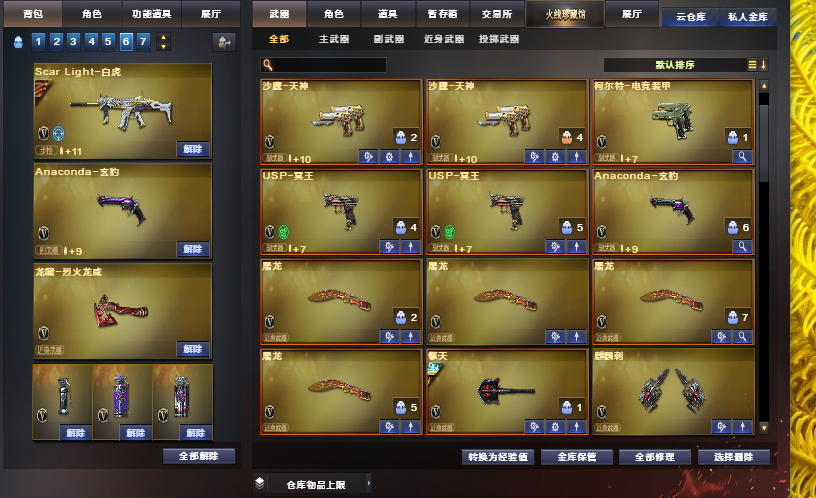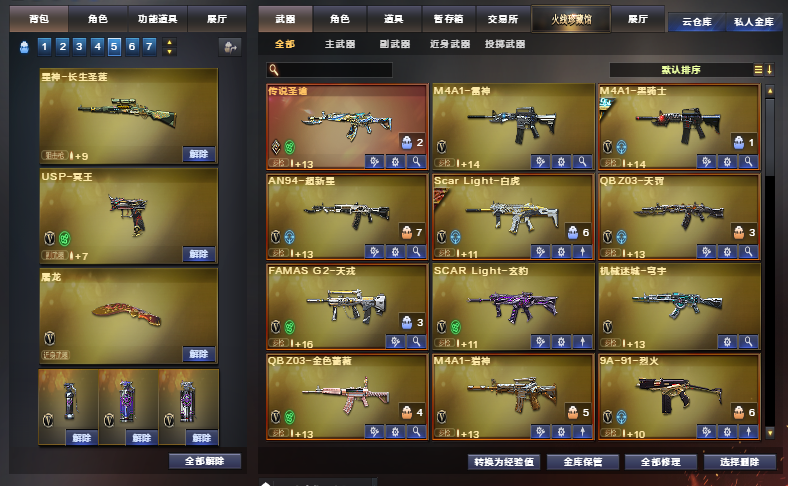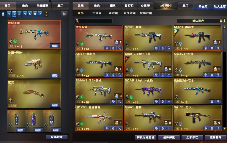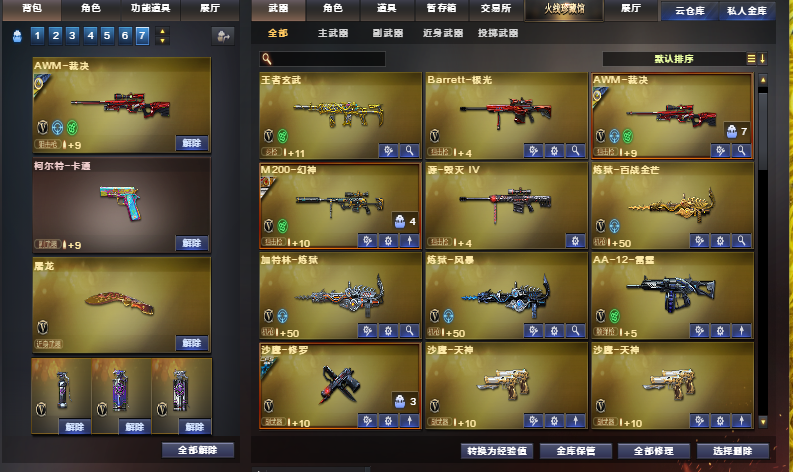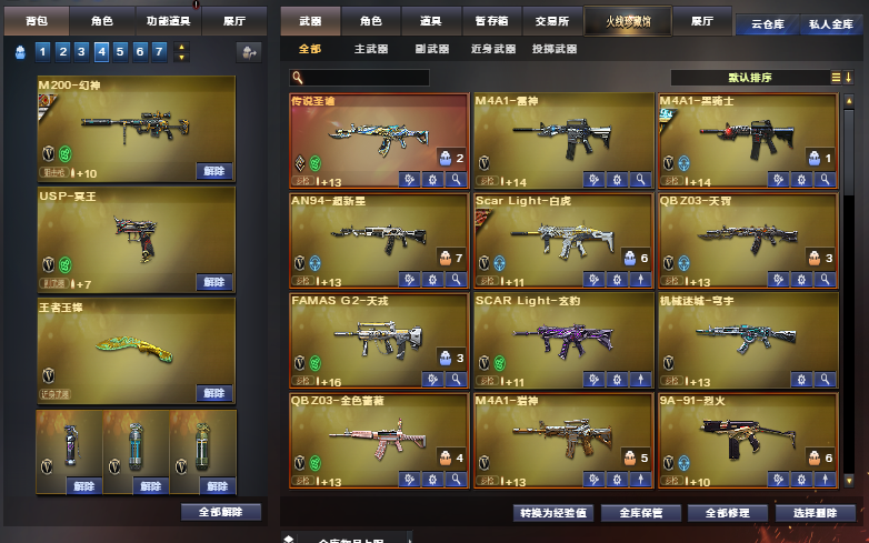 装备描述:绿色游戏,禁止排位退赛王者玉锋;王者冰锋;王者玄武 英雄武器:AN94-超新星;M4A1-黑骑士;屠龙;麒麟刺;Barrett-极光;沙鹰-修罗;加特林-炼狱;沙鹰-天神;M4A1-雷神;9A91-烈火;M200-幻神;恶棍-电竞装甲;机械迷城-穹宇;柯尔特-电竞装甲;炼狱-风暴;烟雾弹-电竞装甲;闪光弹-电竞装甲;Scar Light-白虎;AA-12-雷霆;QBZ03-金色蔷薇;SCAR Light-玄豹;丛林匕首-玄豹;Anaconda-玄豹;FAMAS G2-天戎;USP-冥王;高爆手雷-玄豹;闪光弹-玄豹;烟雾弹-玄豹;QBZ03-天罚;擎天;AWM-裁决;传说圣谕;龙啸-烈火龙威;M4A1-猎神 装饰品:火麒麟-CF STAR;天龙-CF STAR;修罗-CF STAR;雷神-烈虎皮肤;火麒麟-平天大圣;火麒麟-百城;黑骑士-冠军之势;白虎-大汉风骨;战神-流金岁月皮肤;火麒麟-AG战队皮肤;击杀图标-16周年限定;擎天-冠军 之击;裁决-运输船 皮肤;毁灭-风暴;毁灭-黑大圣皮肤;幻神-AG-CFPL S24冠军 皮肤;