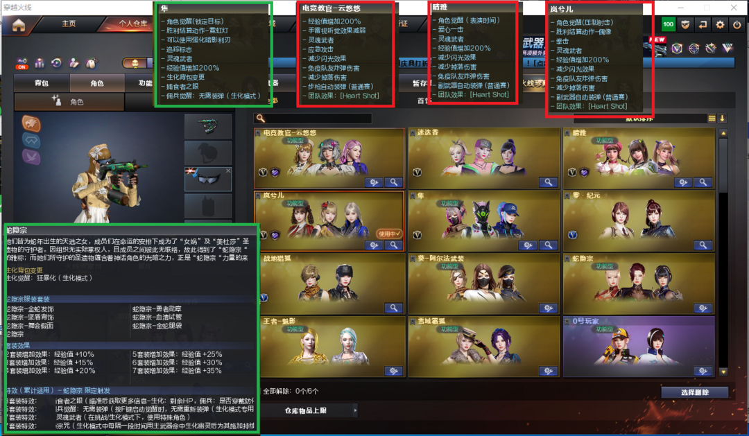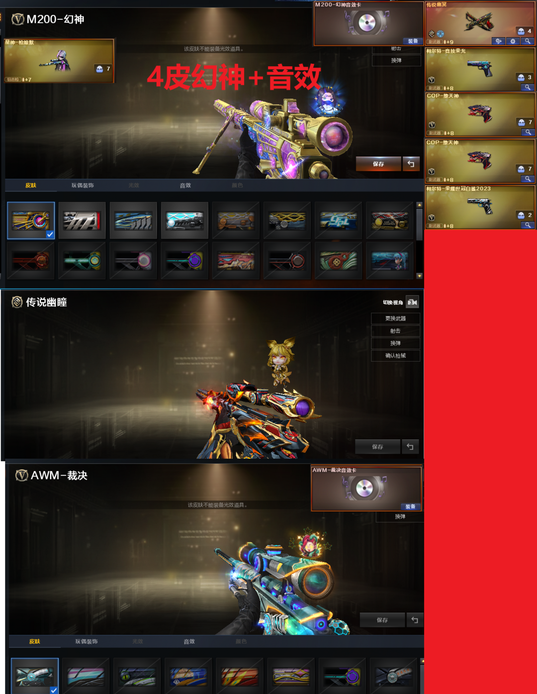 装备描述:排位:可以、、、、、、、生化四防全装(生化背包更换、可以看僵尸血量):无需换弹、5烈龙、盘龙、炼狱、毒蜂、异变清道夫、MAC-涂鸦、炽蝶芒刃、生化雷、超级对讲机、全部弹匣、、、、、、、、爆破四防:幻神4皮+音效(23白鲨、幻神-Heartshot皮肤、星耀、电流骇客皮肤)、传说幽瞳、M200-竞技荣光、星神-小人枪、传说幽瞳、2个COP堕天神、柯尔特竞技荣光、23白鲨柯尔特、八面凌龙、G36幻影、QBZ金色蔷薇、、、幻神音效、裁决音效、炼狱音效、、、7套堕天神、3套竞技荣光、、、生化四防(隼、蛇隐宗)爆破四防(云悠悠、晴雅、岚兮儿)