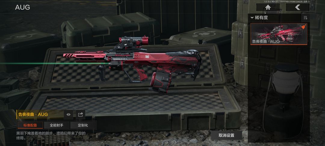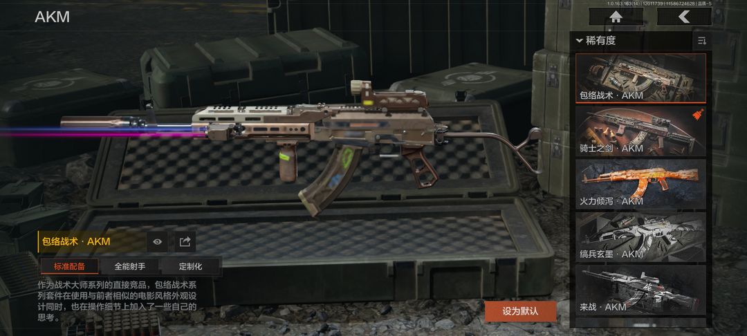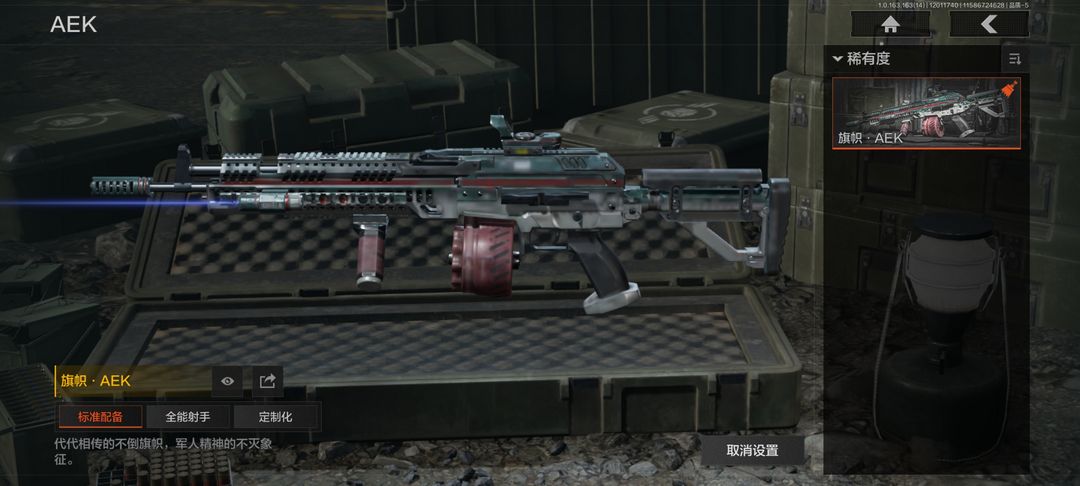 装备描述:【近战武器】:龙魂双节棍,工兵铲,来战开山刀;【角色皮肤】:龙魂武术运动服,王国卫队礼装轻装,都是夜影套装,森林守望特种服;【突击步枪】:包络战术AKM,骑士之剑AKM,火力倾泻AKM,历战AKM,猩红抓痕AKM,缟兵玄墨AKM,来战AKM,潜渊蛇鳞M4A1,和平之手FAL,自喷网格H416,德尔塔小队H416,竞技MDR,正在骇入MDR,玄墨披挂MDR,白垩游魂AK102,玄墨披挂AK102,洞窟遗迹AK102,来战AK74N,山地伪装AK74N战术大师AK74N,火绒AKS74U,告丧夜曲AUG,炎夏浪花AR57,深粉玫瑰ACE31,旗帜AEK,粉绒臻选AN94,阴影AN94,典礼武备Groza,虎纹Groza,绿松石数码Groza,虎纹FAMAS,青瓷涂层SCAR,巡林客T951,绿松石数码T951,骑士之剑T03,虎纹T03,沙漠数码T03,森林迷彩T03,冬夜AK12,骤羽尖啸AK12,沙海AK12,沙海MCX,绿松石数码9A91,绿海猎手AR15;【冲锋枪】:掌中盾MP5,森林迷彩MP5,火力倾泻MP5,玄戈梨花MPX,危险地带P90,无彩调色P90,禁止访问UMP45,自
