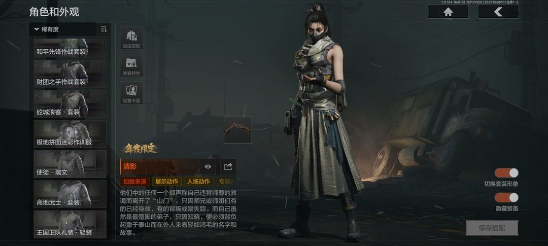 装备描述:30级,历史最高段位:暗区传说,【角色皮肤】:清影,弗雷德,使徒欧瑞恩,和平先锋作战套装,砼城浪客套装,使徒瑞文;【近战武器】:空腔战术,苍穹利爪,S-07折刀,胜利军刀,工兵铲;【手套】:急袭手套;【突击步枪】:冲刺极限QBZ192,包络战术AKM,竞技风潮M4A1,地脉深处FAL,伦琴幻影FAL,林中人FAL,告丧夜曲AUG,战术大师AEK,玉擎天工AN94,战术大师AN94,浮鳞影青QBZ192,骑士之剑AKM,逆火玄石AKM,翠影青锋M4A1,潜渊蛇鳞M4A1,骤羽尖啸M4A1,幻域莎绫M4A1,利齿风暴MDR,鱼跃丹青AK102,涂鸦AK102,战术大师AK74N,雪原凌锋AK74N,逆火玄石F2000,财团之手AR57,动感舞步ACE31,深蓝AEK,伦琴计量AN94,近卫标记Groza,典礼武备Groza,宝石籽料FAMAS,宝石籽料T951,巡林客T951,骑士之剑T03,利齿风暴T03,鱼跃丹青MCX,典礼武备MCX,宝石籽料AR15;【冲锋枪】:玉擎天工MP5,利齿风暴MPX,深蓝MP5,宝石籽料MPX,骤羽尖啸MPX,宝石籽料P90,利齿风暴T79,绿蟒Vecto
