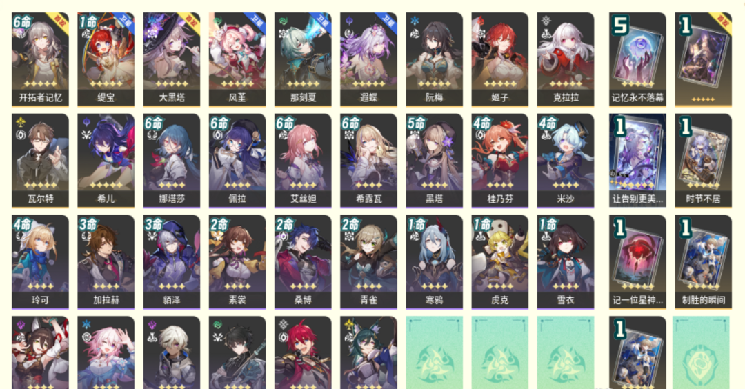 装备描述:68级,女主,22黄,10个五星角色:1命缇宝,大黑塔,风堇,那刻夏,遐蝶,阮梅,姬子,克拉拉,瓦尔特,希儿,7个五星光锥:精5记忆永不落幕,精1向着不可追问处,精1让告别更美一些,精1时节不居,精1记一位星神的陨落,精1制胜的瞬间,精1制胜的瞬间,梦华0,星琼76,星轨专票74,星轨通票19