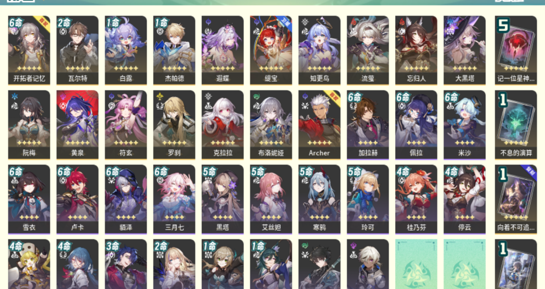 装备描述:70级,女主,28黄,梦华0,星琼2194,星轨专票43,星轨通票4,16个五星角色:2命瓦尔特,1命白露,1命杰帕德,遐蝶,缇宝,知更鸟,流萤,忘归人,大黑塔,阮梅,黄泉,符玄,罗刹,克拉拉,布洛妮娅,Archer,服饰:冬去煦至,4个五星光锥:精5记一位星神的陨落,精1不息的演算,精1向着不可追问处,精1