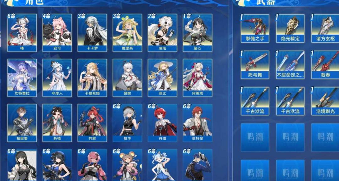 装备描述:80级,43黄,星声:115,月相:447,余波珊瑚:12,铸潮波纹:11,15个五星角色:满命椿, 4命安可, 3命卡卡罗, 3命维里奈, 2命凌阳, 1命鉴心, 坎特蕾拉, 守岸人, 卡提希娅, 赞妮, 菲比, 珂莱塔, 相里要, 折枝, 吟霖;11个四星角色:满命散华, 满命丹瑾, 满命莫特斐, 满命白芷, 满命秧秧, 满命桃祈, 满命灯灯, 满命釉瑚, 满命渊武, 满命秋水, 满命炽霞;9个五星武器:精1掣傀之手, 精1焰光裁定, 精1诸方玄枢, 精1死与舞, 精1不屈命定之