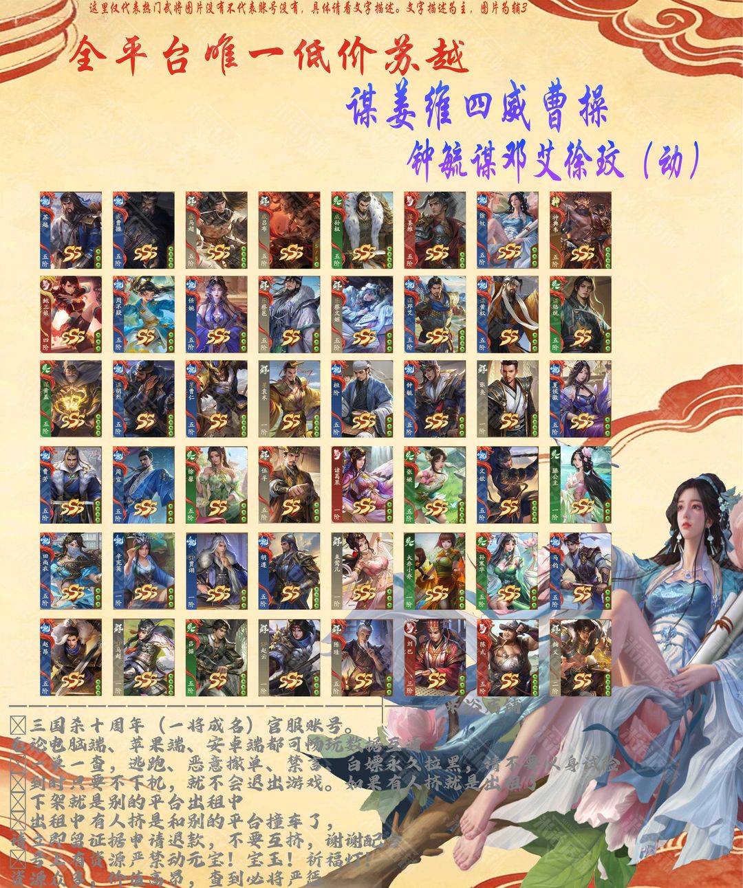 装备描述:苏越四威 谋姜维邓艾钟毓徐妏动 苏越 威曹操 威马超 威孙权 威吕布 谋姜维 谋邓艾 乐菜文姬(限)乐菜邕 星曹仁 任婉 钟毓 徐妏(芳华动)桓阶 张奂 曹芳 夏侯徽 周宣 马铁 徐馨 田尚衣 神典韦 鲍三娘 谋骆统 谋黄权 谋胡烈 孙寒华 藤公主 张璇 秦朗 陈硅 贾充 刘巴 吕据 文钦 周不疑 胡遵 王威 孟达 陈式 马均 伍孚 赵昂等
