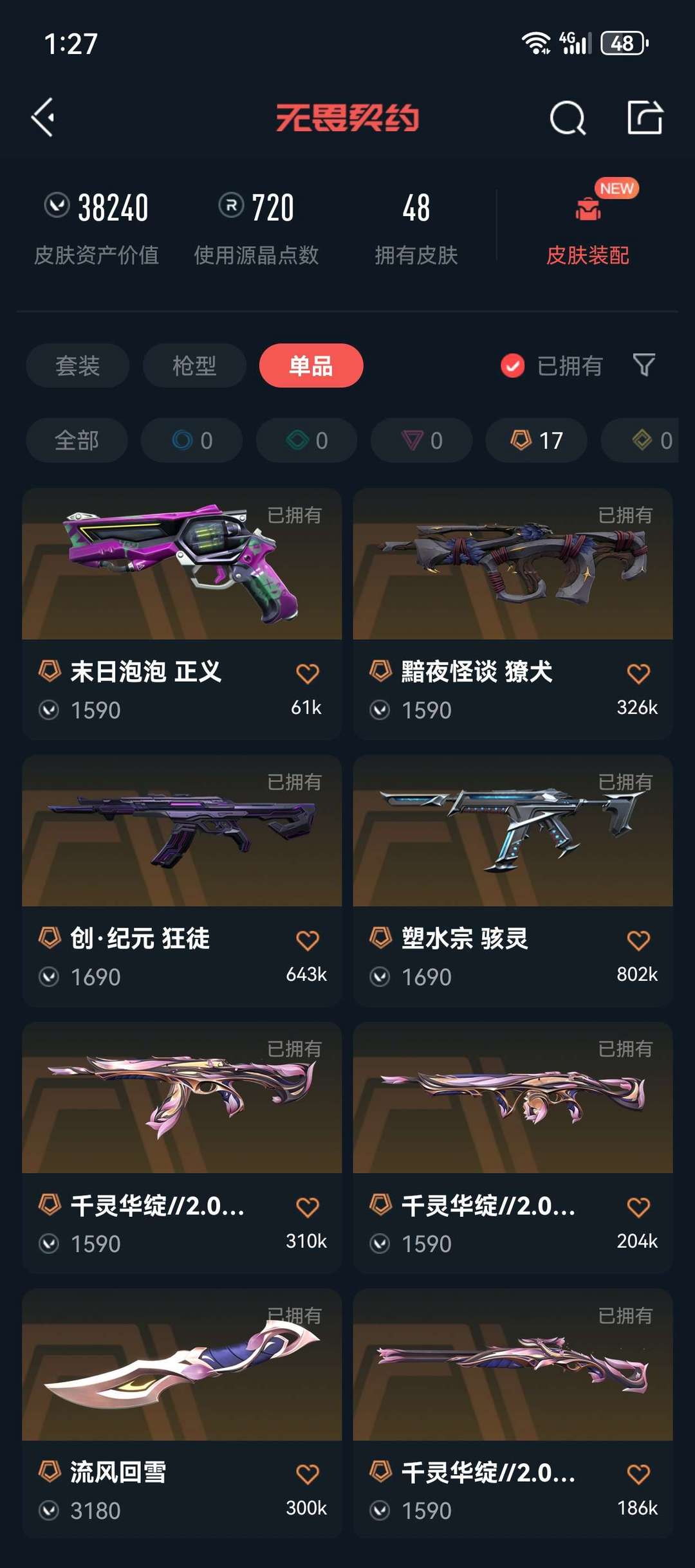 装备描述:无畏契约国服端游25冠军狂徒盖亚狂徒紫金狂徒威龙鬼魅咻咻奥丁光明哨兵骇灵蝴蝶刀神之刃影刃不准开挂 英雄是全的,还有每月的免费皮肤,枪皮不算多,但是都是精品,还有限定的25年冠军狂徒,都是小本生意,以后还会买怜悯的可以期待一下我,这次的ora颗秒套的幻影也有哦,可以试玩,封禁中是禁言的意思,可以排位