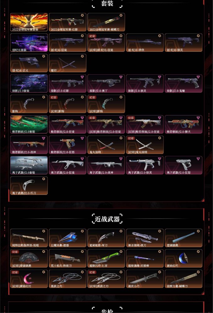 装备描述:掠影2.0冠军2022全球创纪元般若假面2.0离子武器2.0澄湖澈艳超限闪存匕首黑波之刃剥皮小刀侦察力量蝴蝶刀艾莉沃的梦之翼狂徒天界神兵2.0幻影紫阙金琅狂徒盖亚的复仇2.0幻影侦察力量幻影冰点凝结狂徒掠影狂徒堕天遗武冥驹堕天遗武骇灵天界神兵蜂刺离子武器雄鹿vctblg标配天界神兵鬼魅
