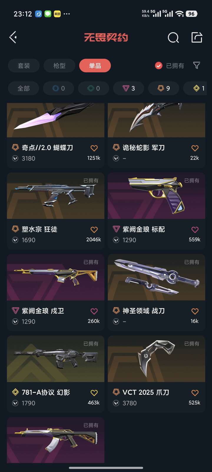 装备描述:✅ 核心硬货全解锁: ▫️ 近战:奇点2.0蝴蝶刀、VCT 2025爪刀、诡秘蛇影军刀、神圣领域战刀 ▫️ 狂徒:混沌序曲、塑水宗、紫阙金琅(三把热门狂徒皮肤全覆盖) ▫️ 幻影:黯夜怪谈、781-A协议(限定+热门款双持) ▫️ 其他:奇点战神、日耀风暴遗器、紫阙金琅标配/戍卫