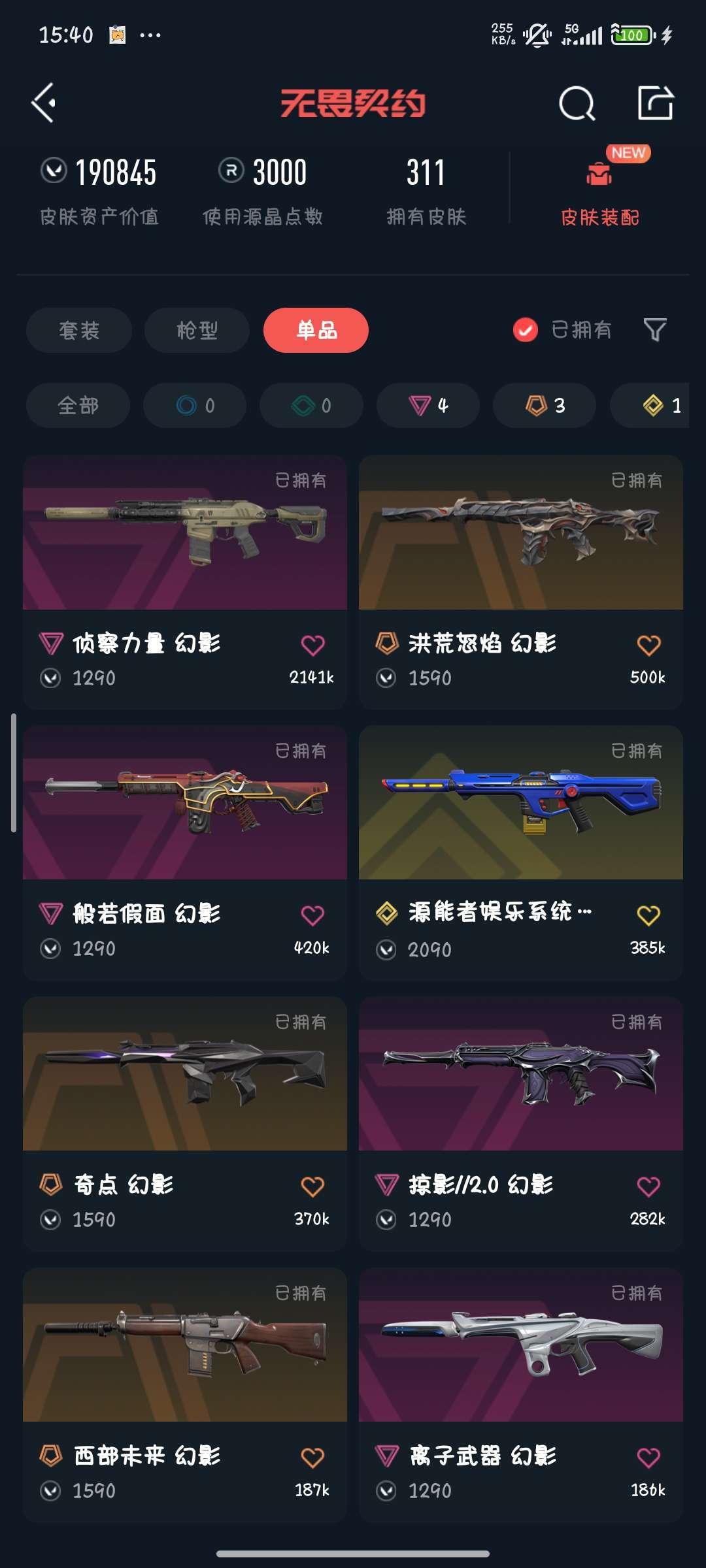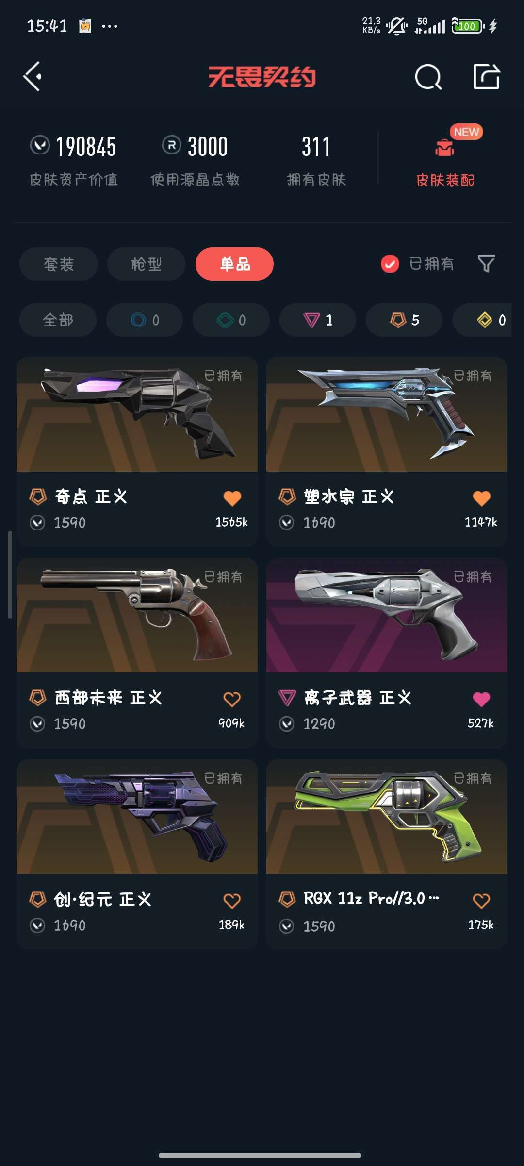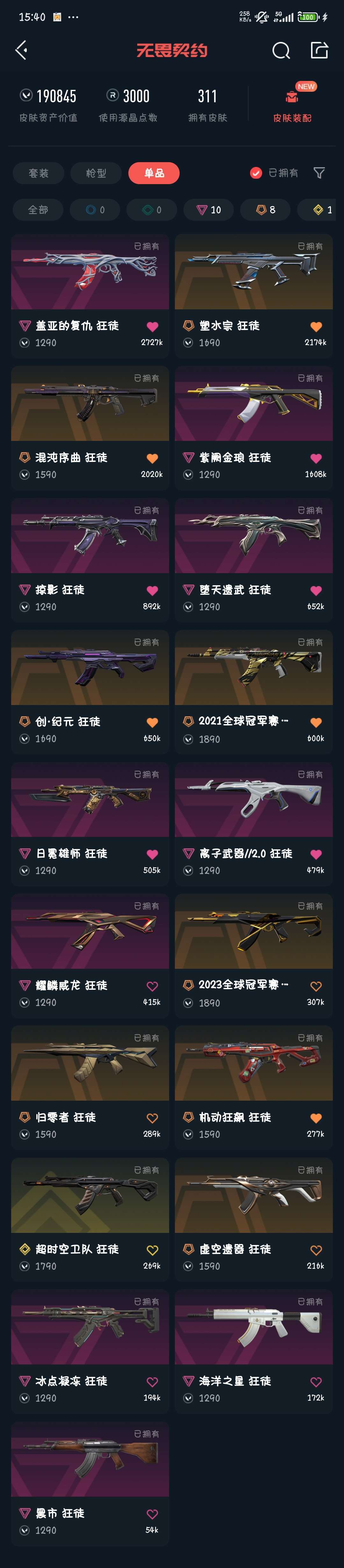 装备描述:1. 19w+超高皮肤资产,304款随心选,对局排面直接拉满! 2. 超时空卫队全套集齐,紫阙金琅、离子武器等热门系列全覆盖! 3. 源能者娱乐系统、堕天遗武珍稀款扎堆,顶配皮肤体验一步到位! 4、全武器有毕业皮且R点已解锁!