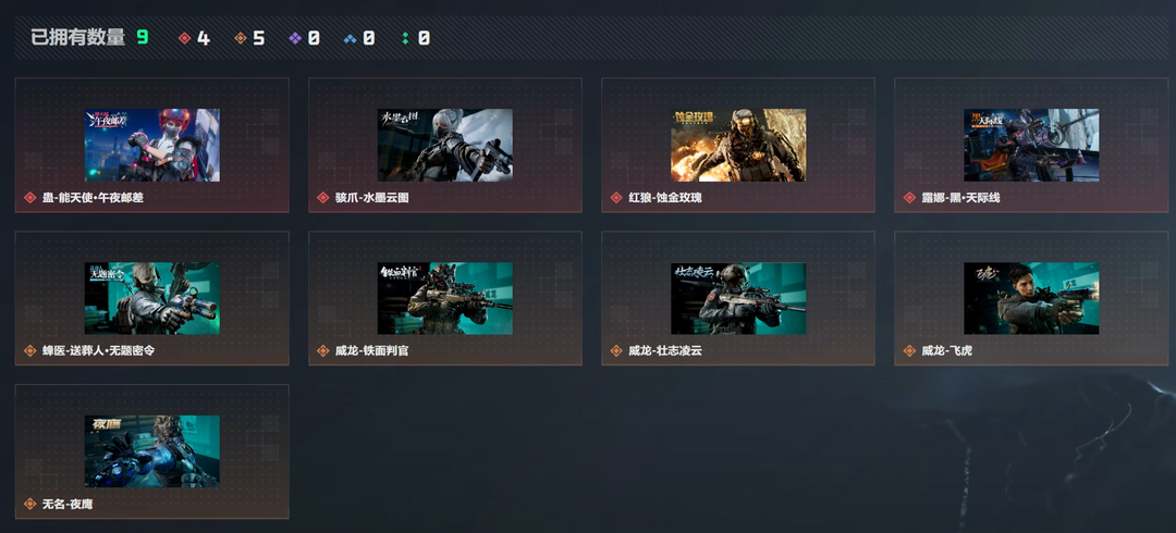 皮肤号 极品号✨4红皮7体力✨飞虎吴彦祖✨影锋刀皮✨K416命运砖皮✨蚀金玫瑰✨维什戴尔✨午夜邮差✨天际线