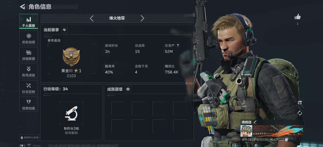 装备描述:解锁了全部烽火地图,训练中心和靶场都是4级,主打就是哟个性价比