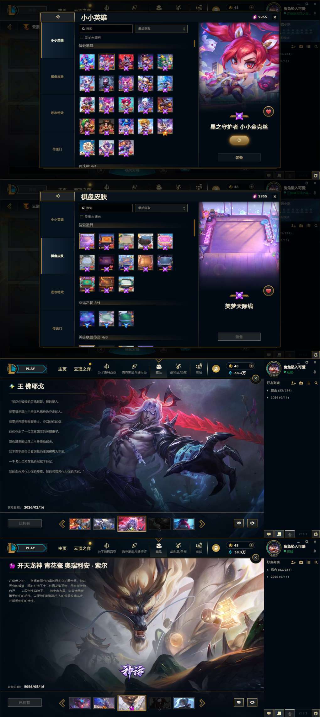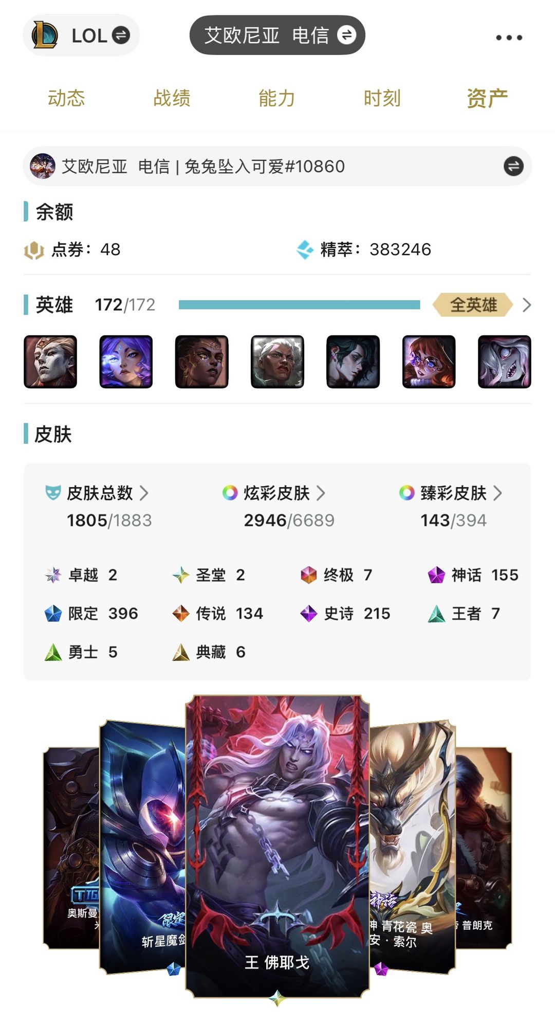 装备描述:1805原皮数,2913炫彩数,云顶36神话。 祝各位租客马年大吉,游戏顺意,天天开心!