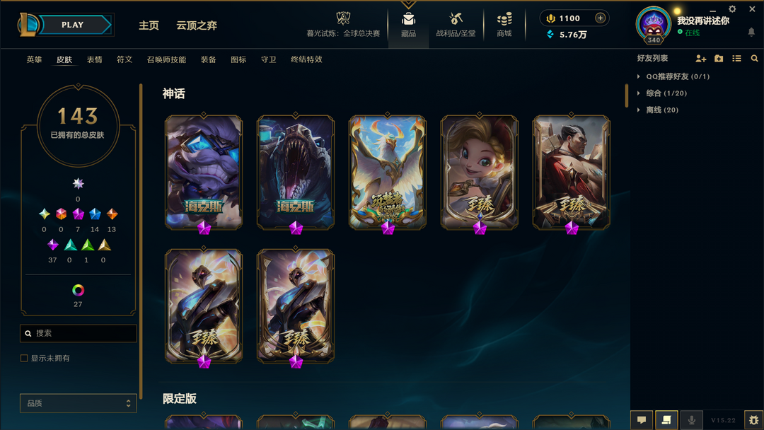 装备描述:英雄数量:全英雄;皮肤数量:143,其中包括神话皮肤数量:7,限定皮肤数量:14,传说级皮肤数量:13,史诗级皮肤数量:37,勇士级皮肤数量:1;表情数量:129;炫彩皮肤数量:27。账号无任何限制,随意使用!