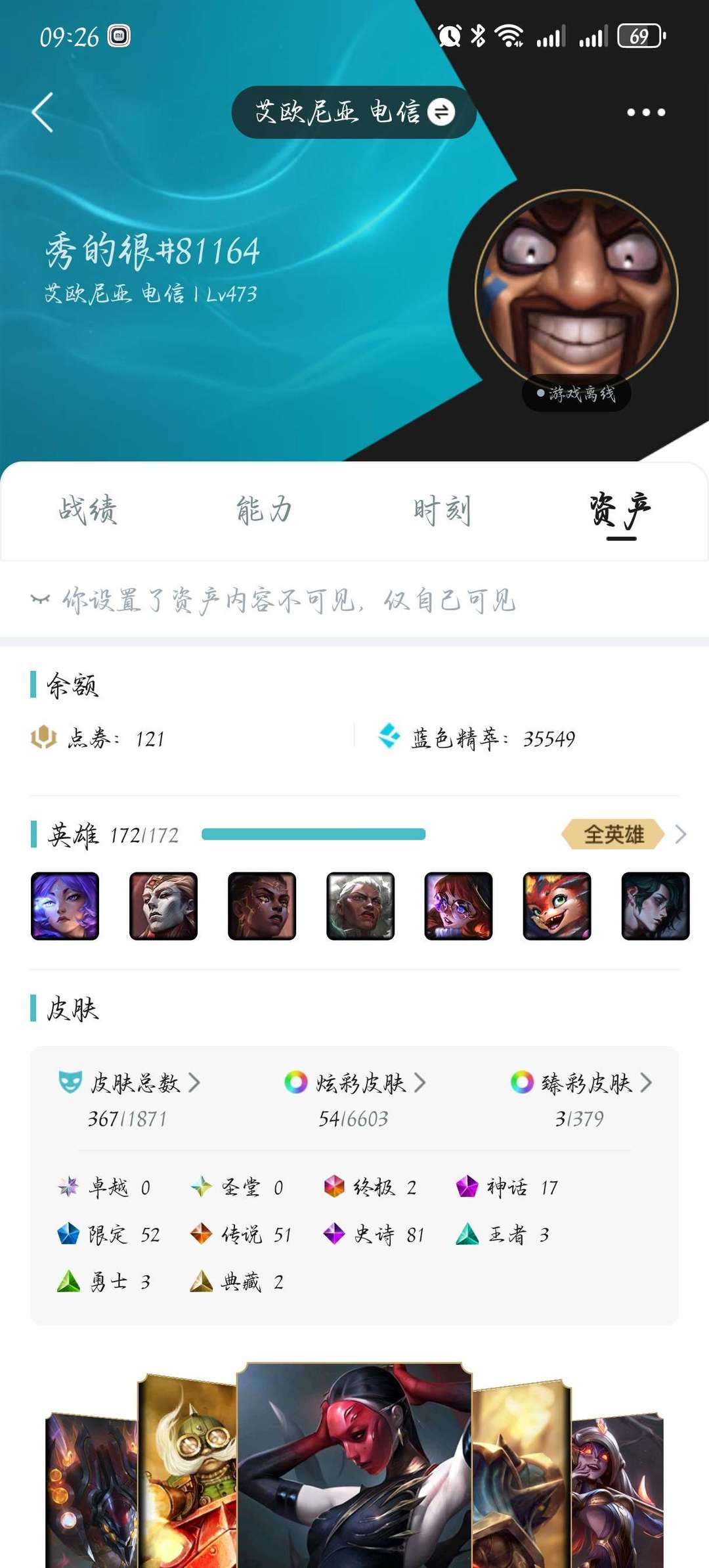 一区账号,无段位,全英雄多皮肤。有拉克丝和赏金的终极皮肤,ig 冠军皮全套