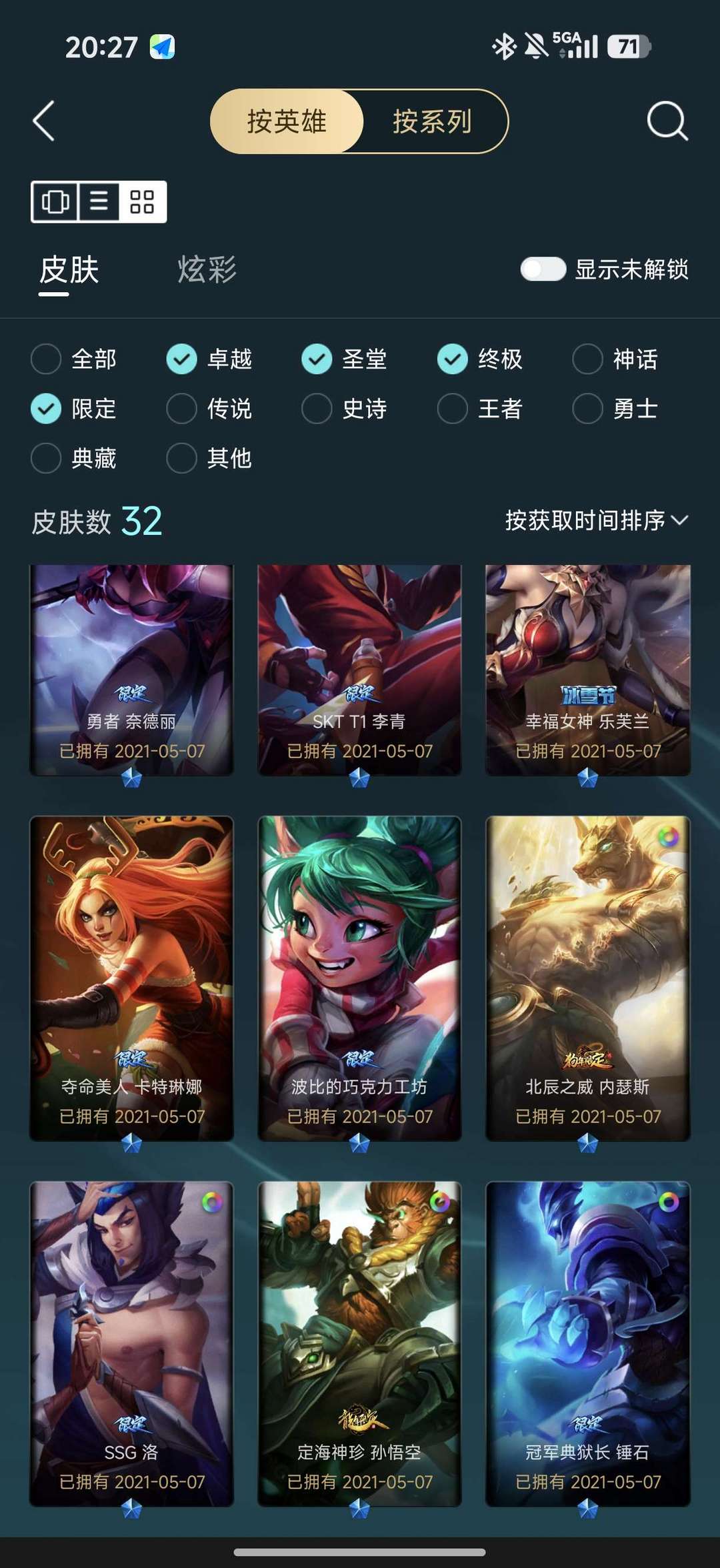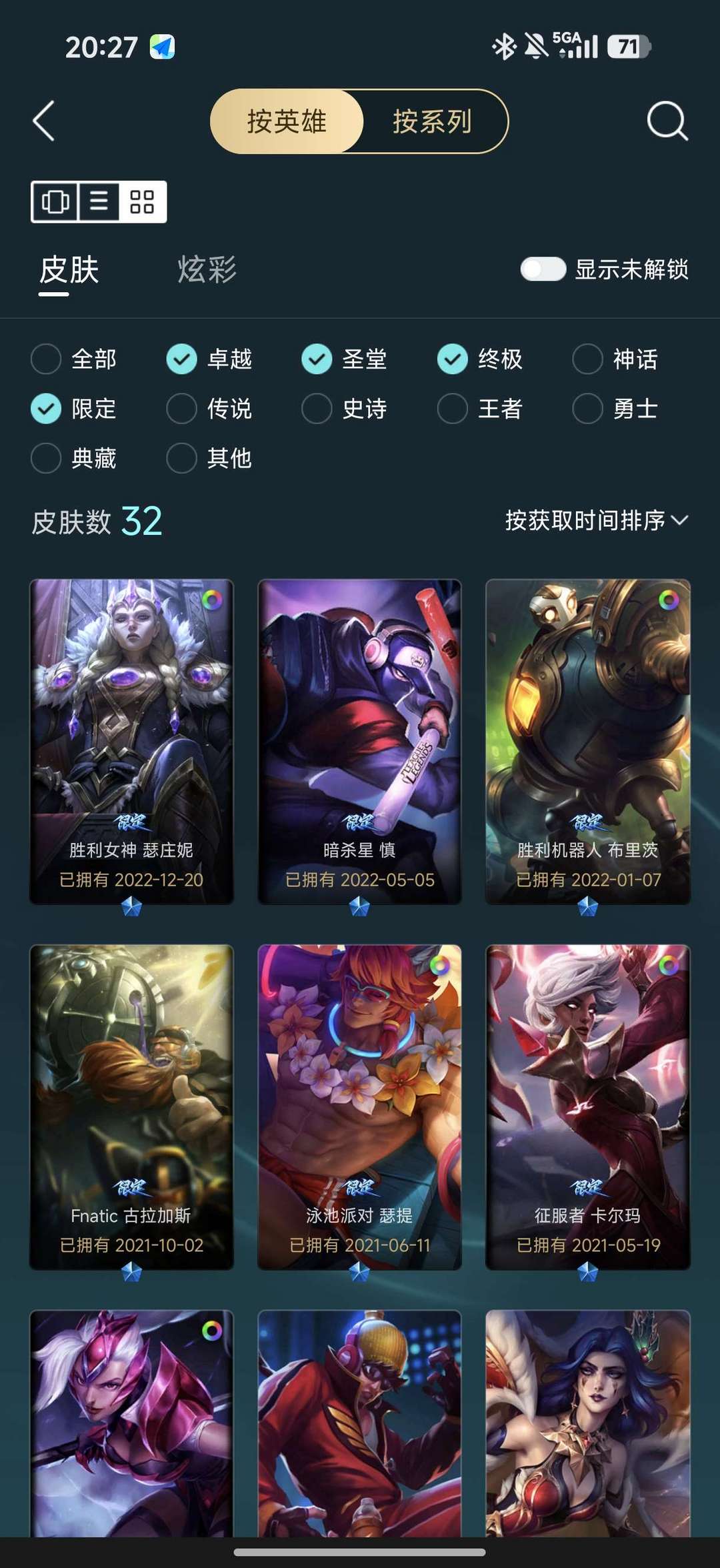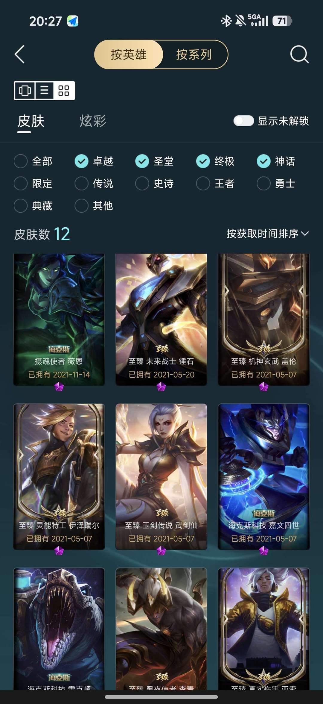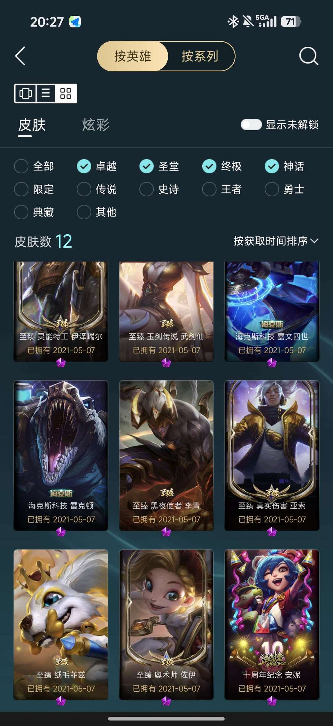 一至臻56炫彩12神话32限定28传说53史诗256皮肤,全是精品皮。145英雄