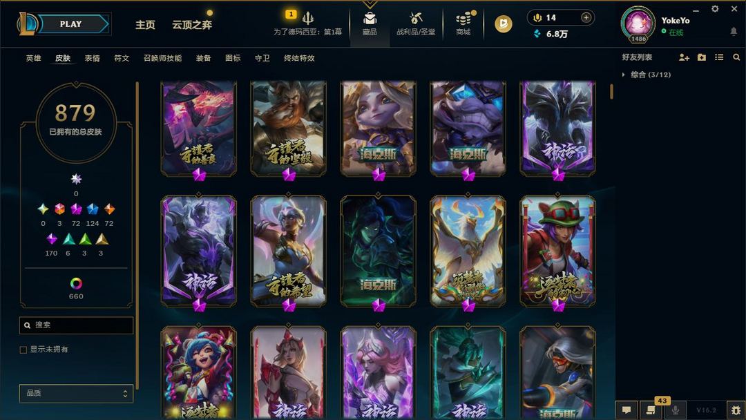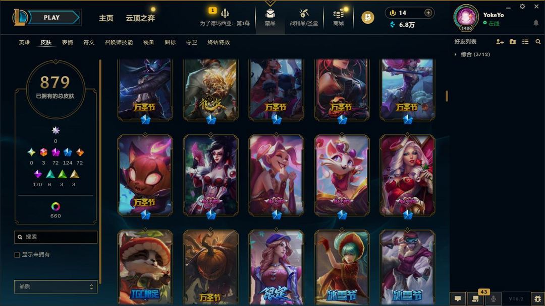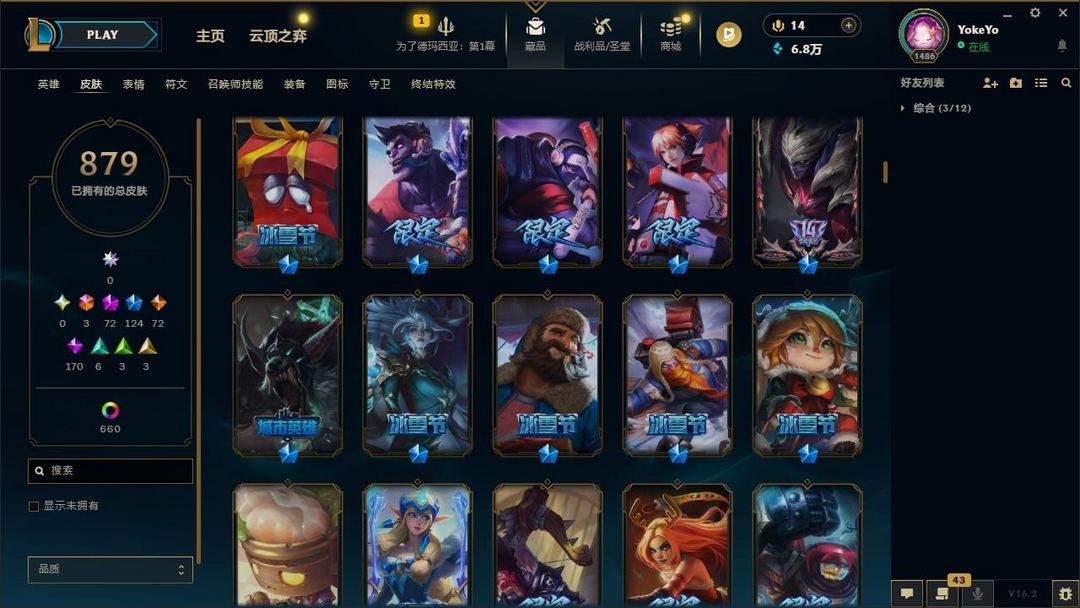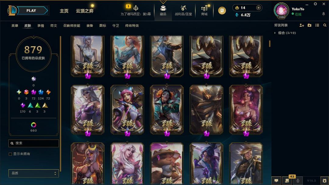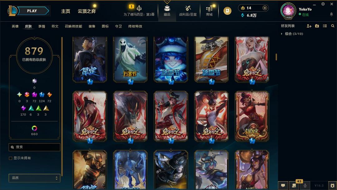 【LOL大王】1500P乄879原皮乄660炫彩乄72神话乄124限定乄龙虾