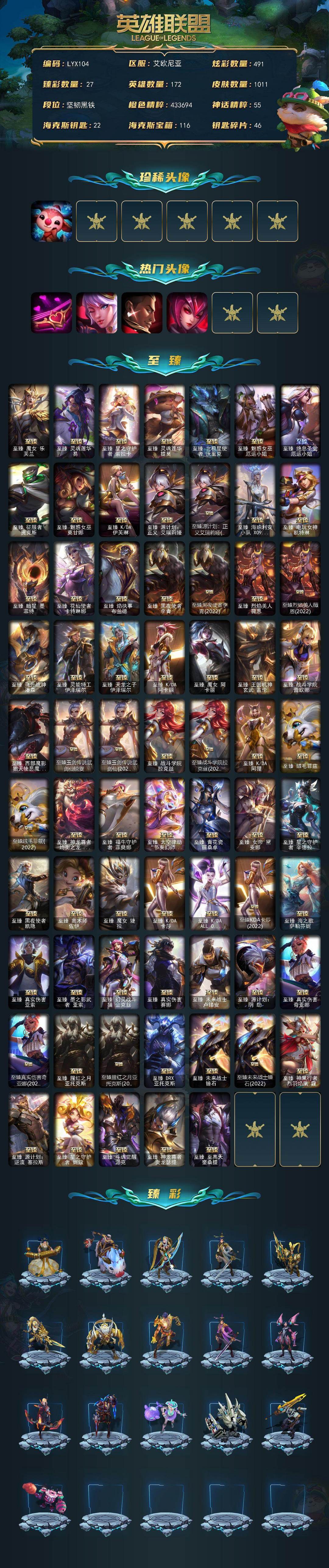 装备描述:172英雄-1011皮肤-491炫彩-6终极-91神话-161限定-84传说-211史诗 【珍稀头像】:至爱的鹿头像 【热门头像】:爱情之歌头像,觅心之翼奎因头像,觅心游侠卢锡安头像,勇者阿狸头像 【至臻皮肤】:至臻魔女乐芙兰,至臻灵魂莲华易,至臻星之守护者索拉卡,至臻灵魂莲华提莫,至臻北极星使者沃里克,至臻魅惑女巫厄运小姐,至臻绝息圣堂厄运小姐,至臻征服者贾克斯,至臻魅惑女巫莫甘娜,至臻KDA伊芙琳,至臻源计划正义艾瑞莉娅,至臻源计划:正义艾瑞莉娅(2022),至臻海珀利安小队X09星环灵风迦娜,至臻电玩女神凯特琳,至臻暗星墨菲特,至臻花仙使者卡特琳娜,至臻焰执事布兰德,至臻黑夜使者李青,至臻黑夜使者李青(2022),至臻烈焰美人薇恩,至臻烈焰美人薇恩(2022),至臻飞升战神潘森,至臻灵能特工伊泽瑞尔,至臻天龙之子伊泽瑞尔,至臻KDA阿卡丽,至臻魔女阿卡丽,至臻王国机神玄武盖伦,至臻战斗学院蕾欧娜,至臻西部魔影猎天使恶魔泰隆,至臻玉剑传说武剑仙锐雯,至臻玉剑传说武剑仙(2022),至臻战斗学院拉克丝,至臻战斗学院拉克丝(2022),至臻KDA阿狸,至臻绒毛菲兹,至臻绒毛菲兹(202