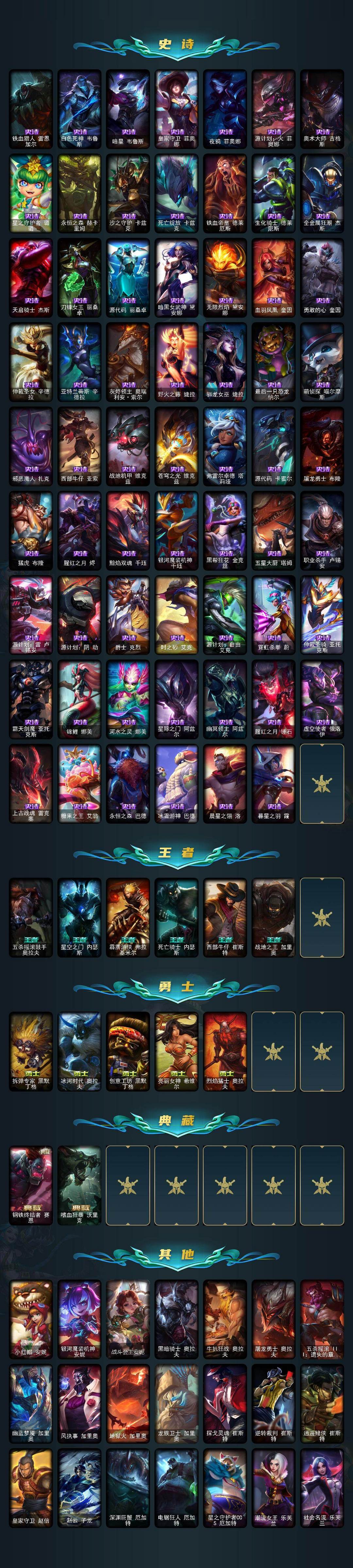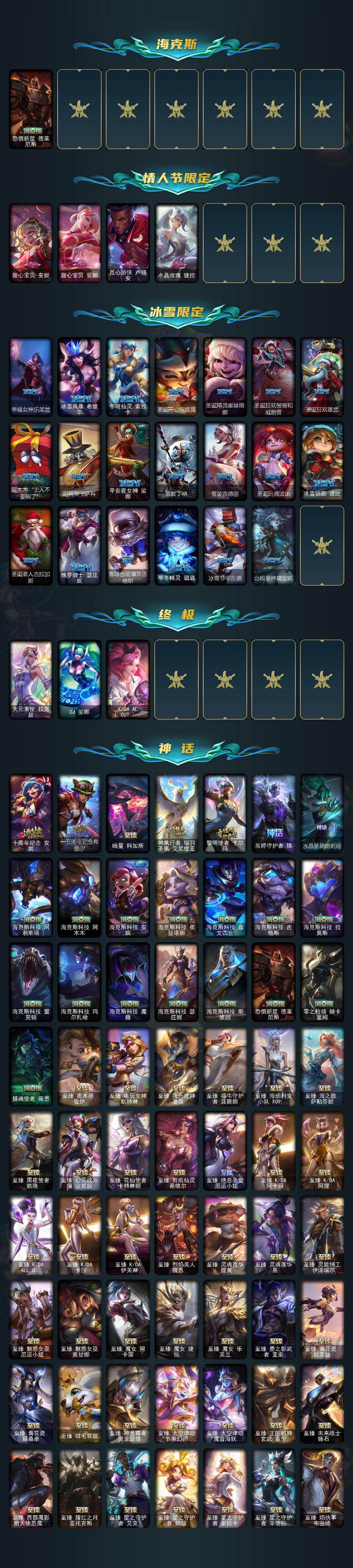 装备描述:170英雄-907皮肤-705炫彩-5终极-77神话-122限定-91传说-181史诗 【热门头像】:春晖神女头像,战斗学院拉克丝头像,暗星女皇拉克丝头像,耀星女皇拉克丝头像,星守索拉卡头像 【至臻皮肤】:至臻魔女乐芙兰,至臻灵魂莲华易,至臻剪纸仙灵希维尔,至臻星之守护者索拉卡,至臻灵魂莲华提莫,至臻魅惑女巫厄运小姐,至臻绝息圣堂厄运小姐,至臻征服者贾克斯,至臻魅惑女巫莫甘娜,至臻KDA伊芙琳,至臻玉剑传说琴仙子娑娜,至臻源计划正义艾瑞莉娅,至臻海珀利安小队X09星环灵风迦娜,至臻电玩女神凯特琳,至臻花仙使者卡特琳娜,至臻焰执事布兰德,至臻烈焰美人薇恩,至臻飞升战神潘森,至臻灵能特工伊泽瑞尔,至臻KDA阿卡丽,至臻魔女阿卡丽,至臻王国机神玄武盖伦,至臻战斗学院蕾欧娜,至臻西部魔影猎天使恶魔泰隆,至臻玉剑传说武剑仙锐雯,至臻战斗学院拉克丝,至臻青花瓷拉克丝,至臻灵魂莲华拉克丝,至臻KDA阿狸,至臻绒毛菲兹,至臻福牛守护者菲奥娜,至臻太空律动节奏幻师璐璐,至臻T1杰斯,至臻青花瓷丽桑卓,至臻星之守护者辛德拉,至臻黑夜使者凯隐,至臻奥术师佐伊,至臻魔女婕拉,至臻KDA卡莎,