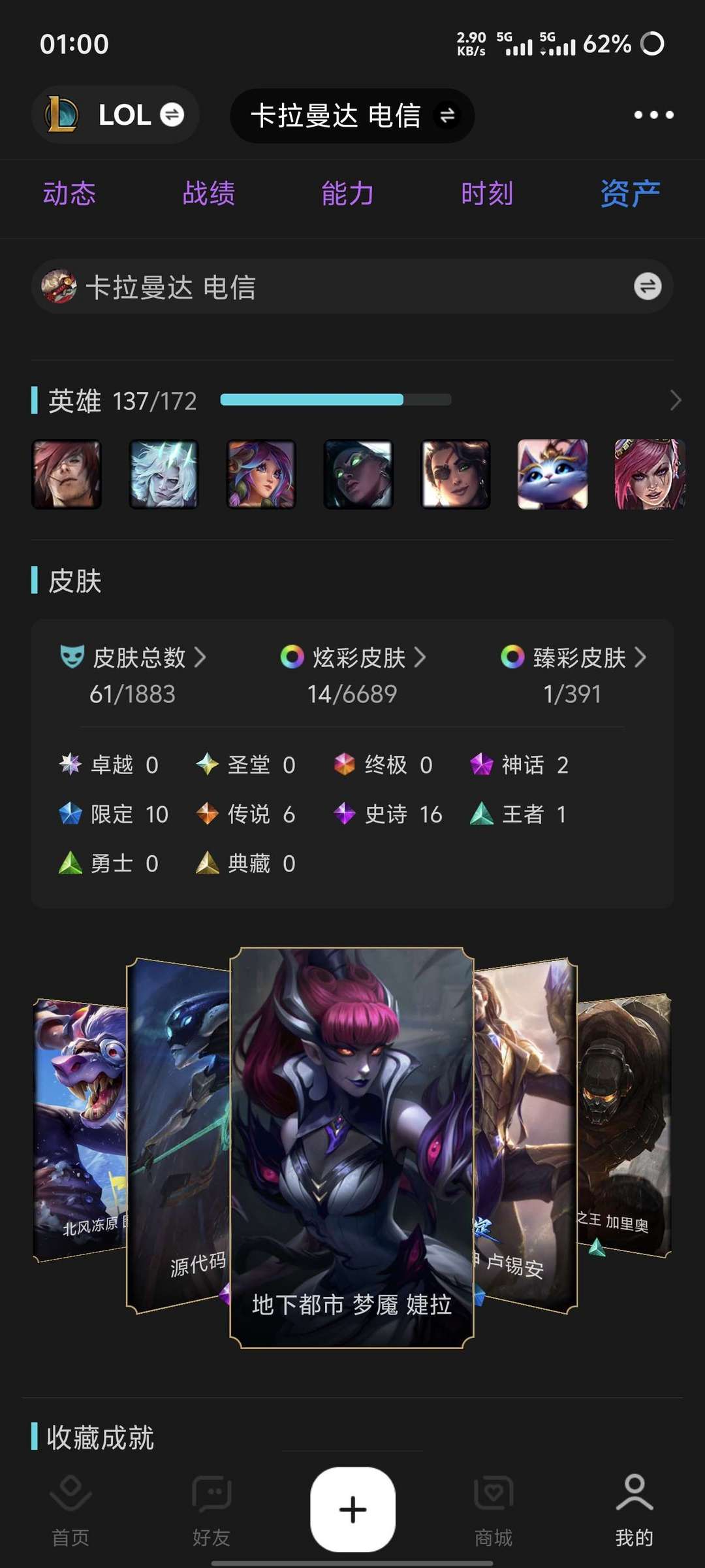 装备描述:账号基本情况】 · 大区:卡拉曼达(电信) · 英雄:137个(基础齐全) · 皮肤总数:61款 · 核心亮点皮肤:神话皮肤(2款) + 限定皮肤(10款) + 传说/史诗皮肤等 · 资产:蓝色精萃 12941(可购买新英雄) 1. 练英雄/娱乐首选:英雄池足够,精粹多,适合练习新英雄、打匹配娱乐,无段位压力(或低段位压力)。 2.稀有体验:拥有市面上不多见的10款限定皮肤,满足收藏体验欲。 3. 纯净小号:无不良记录,可安全使用。 【适合人群】 ✅ 想低成本体验多个皮肤的玩家 ✅ 需要小号练习英雄、打灵活组的玩家 ✅ 限定皮肤爱好者,想体验不同手感的玩家 ✅ 主号在别的区,想来卡拉曼达体验对局的游客 【租用规则与须知】(务必写明,保护账号) · 禁止使用外挂、脚本、消极游戏(挂机、骂人),造成封号需照价赔偿。 · 禁止修改账号任何资料(ID、密码、绑定手机等)。 · 禁止分解、出售皮肤、消耗蓝色精萃及未来可能获得的点券。 · 支持游戏内正常打字交流。