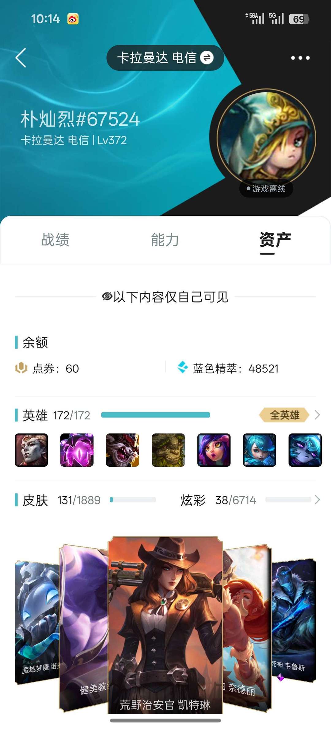 装备描述:全英雄 15个限定皮肤 12个传说皮肤 35个史诗皮肤 随时在线 欢迎个位老板租号 祝老板大乱斗把把天胡 排位把把c