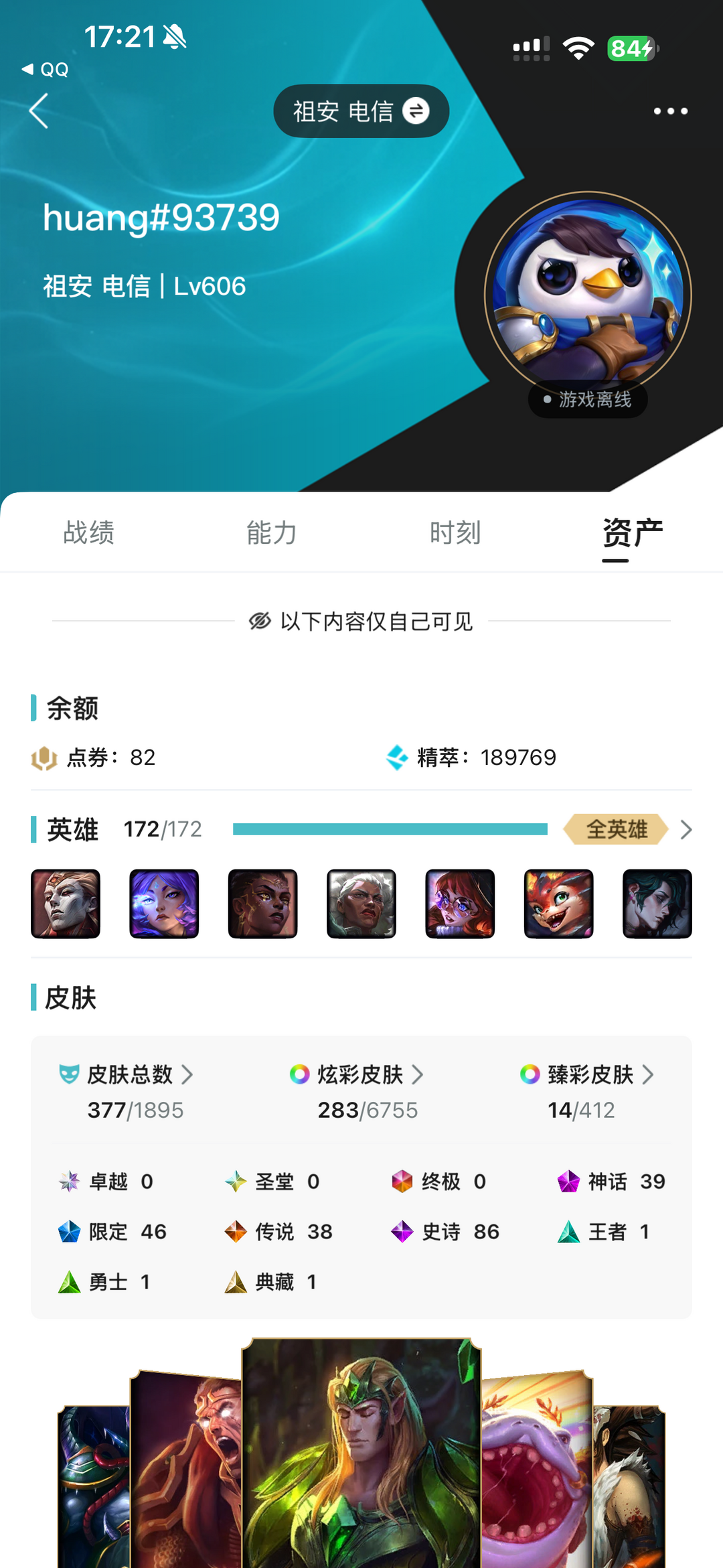 装备描述:联盟一区祖安大师300分体验高端局狙击主播练技术600原皮全是好皮肤