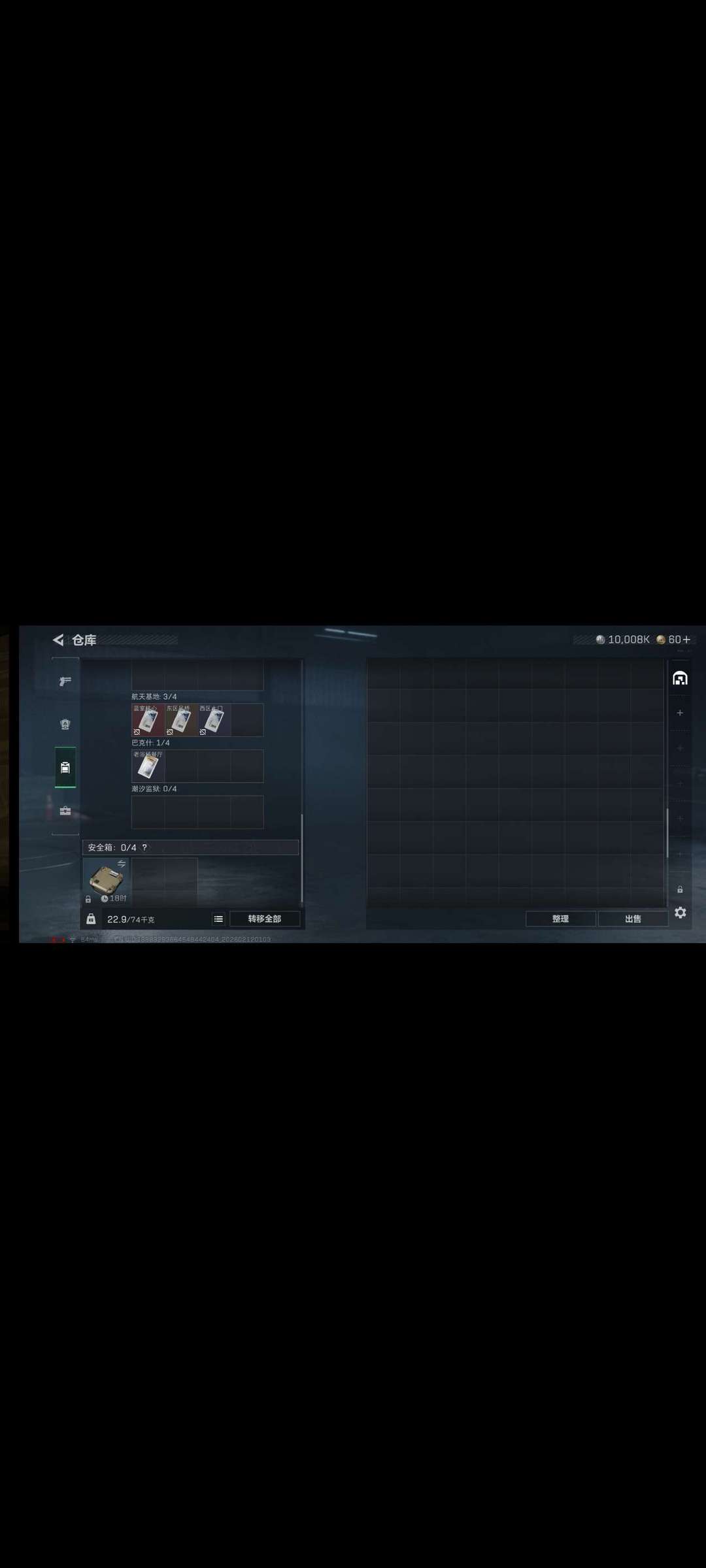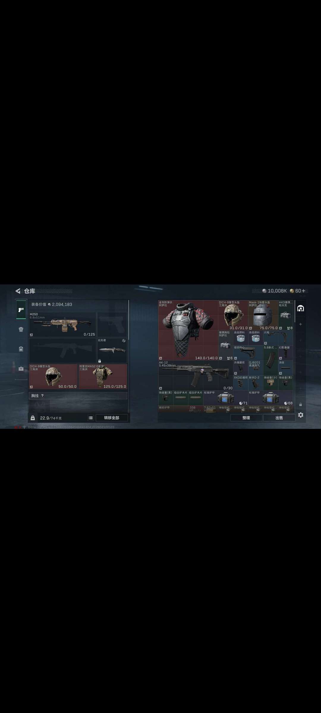 千万哈夫币 (未冻结)有AW子弹两套六套全装,现金有一千w哈佛币有航天图钥匙,登陆被冻结是正常现象可以多登陆几次