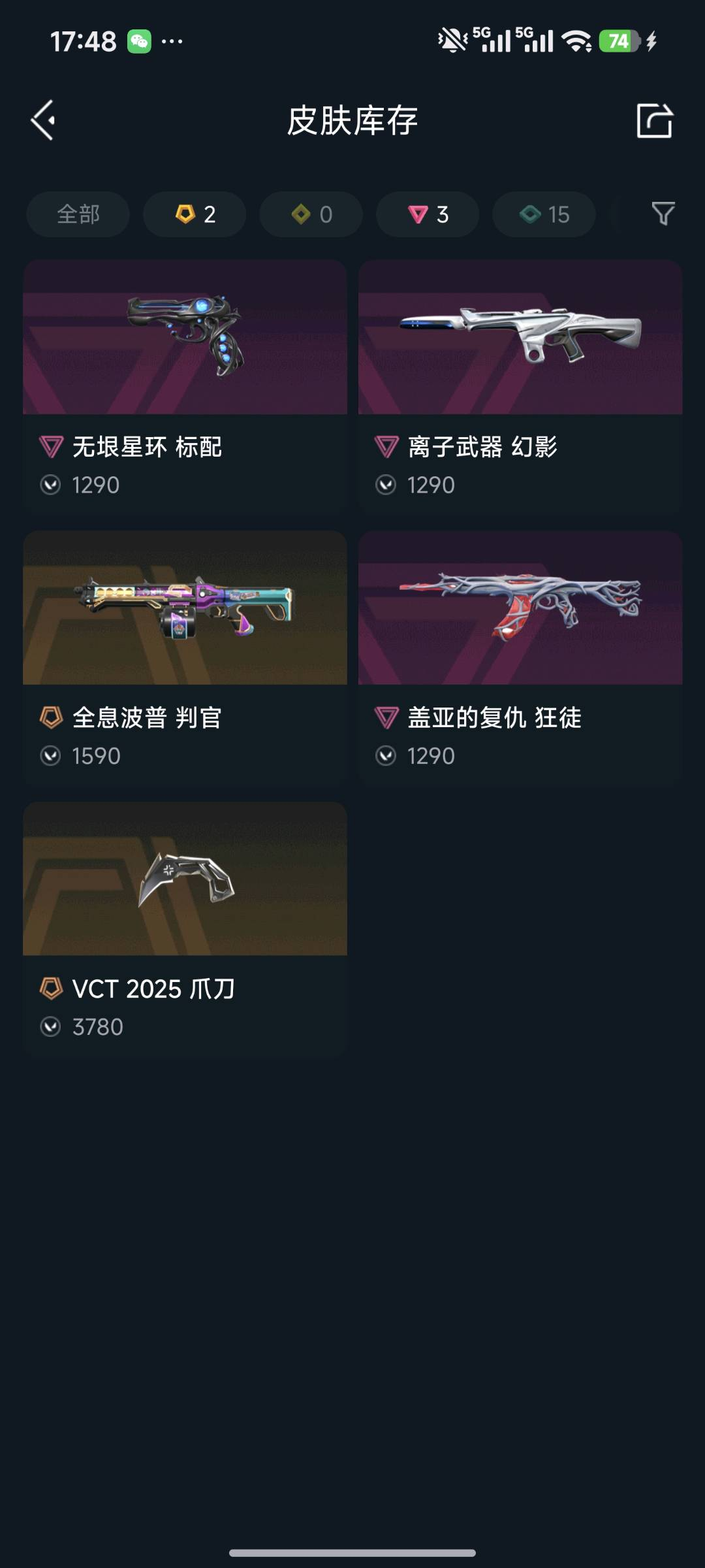 满炫彩满炫彩VCT爪刀⭐️满炫彩盖亚狂徒⭐️满级离子幻影⭐️满炫彩全息判官⭐️满炫彩无垠星环标配