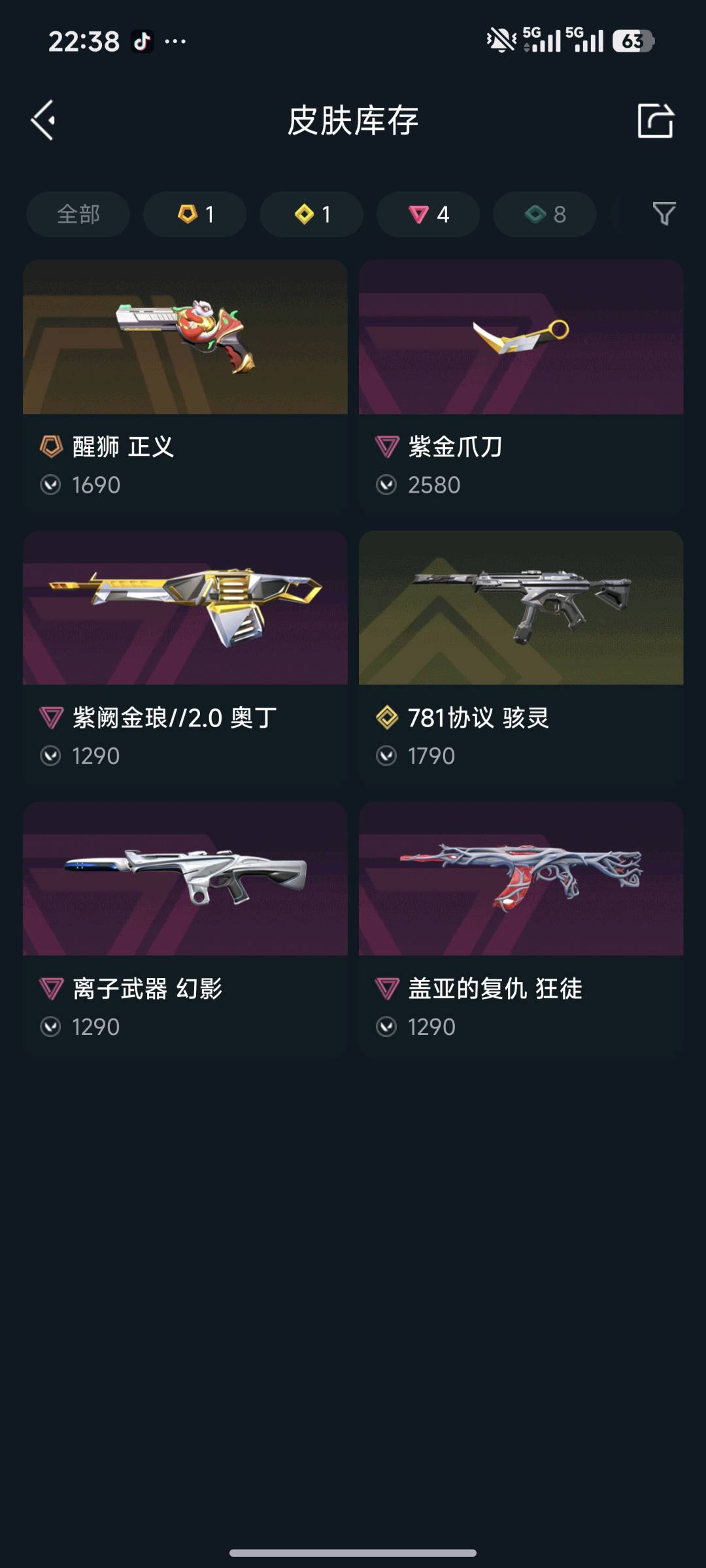 满级紫金爪刀⭐️满炫彩盖亚狂徒⭐️满级离子幻影⭐️满级781骇灵⭐️满级醒狮正义⭐️满级紫阙奥丁