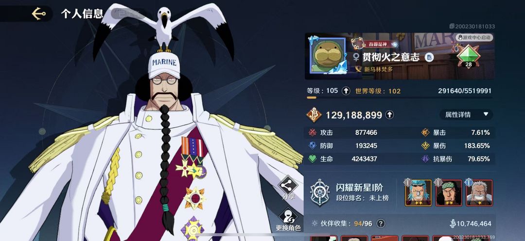 装备描述:满红/ 满金 /战国/ 麦哲伦 /黄猿 女帝/艾斯/ 一点三亿赏金/ 全空岛贝 /背景全 /应有尽有