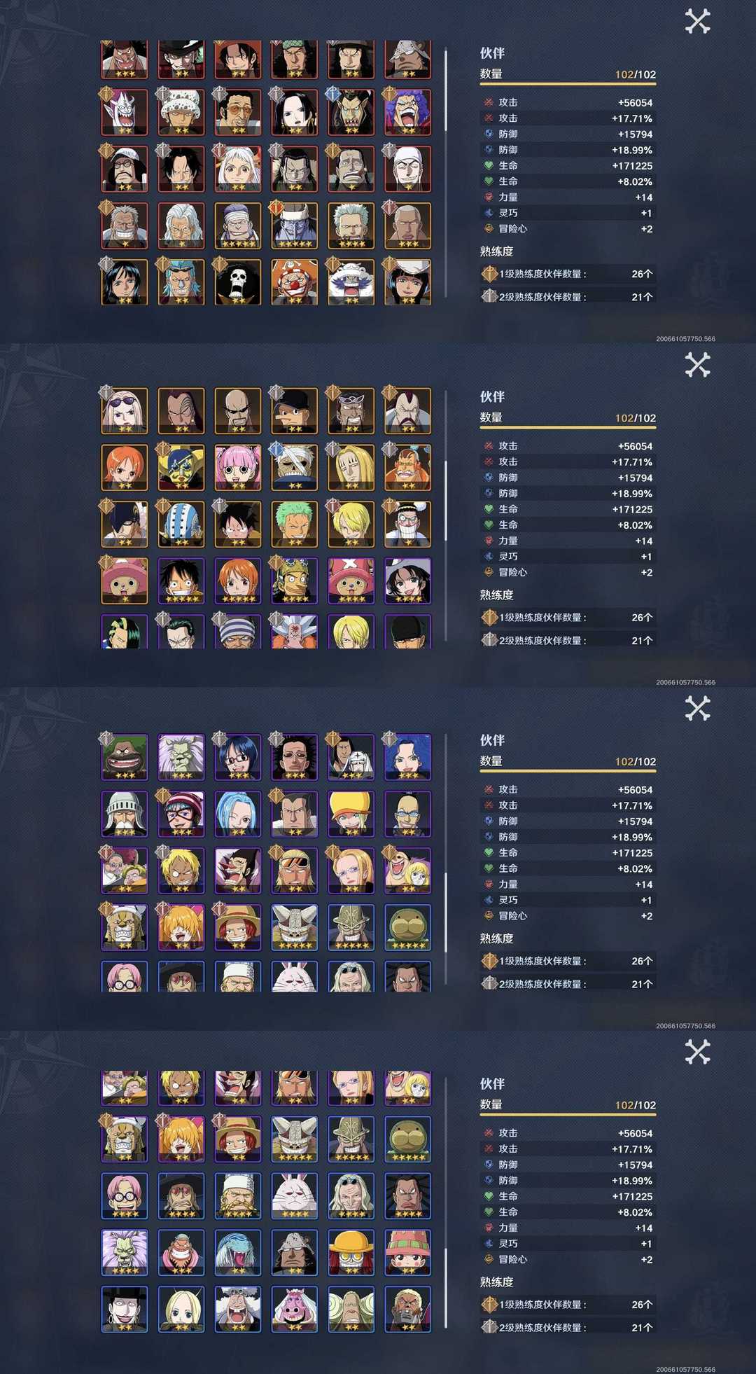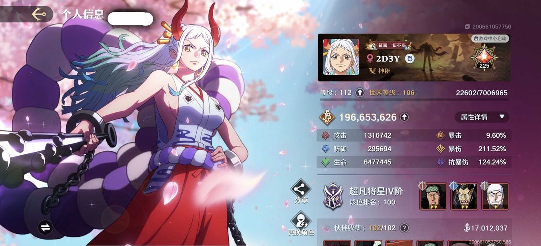 ♥顶上老沙♥雷利♥全角色♥全信物♥全时装♥102伙伴♥20红♥1.96亿赏金♥全奥义66区♥
