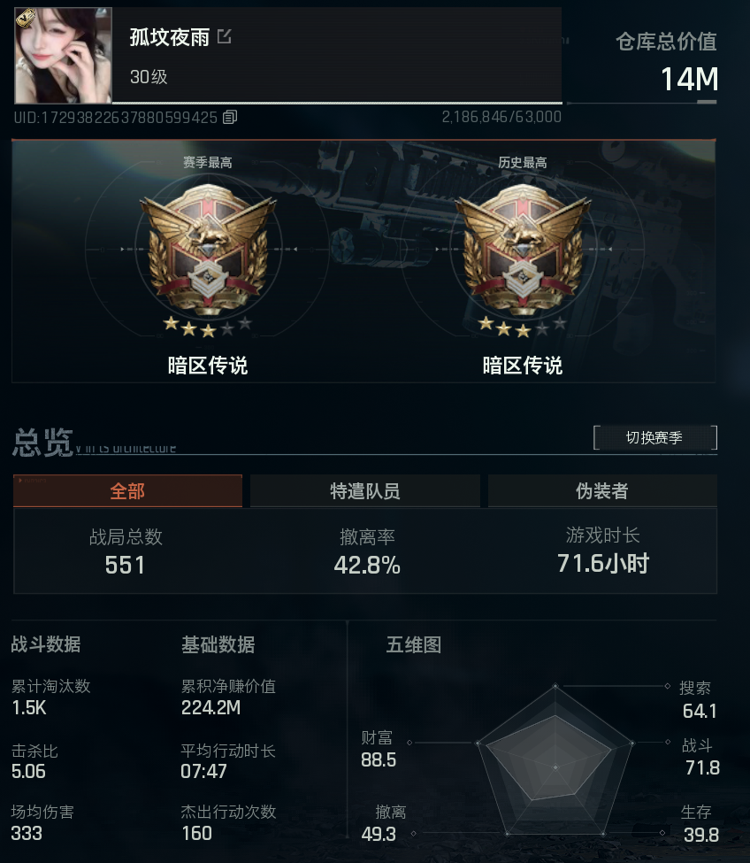 ⭐纯币1000W⭐战斗分71.8⭐3*3钛金安全箱9格⭐14M⭐竞技套⭐