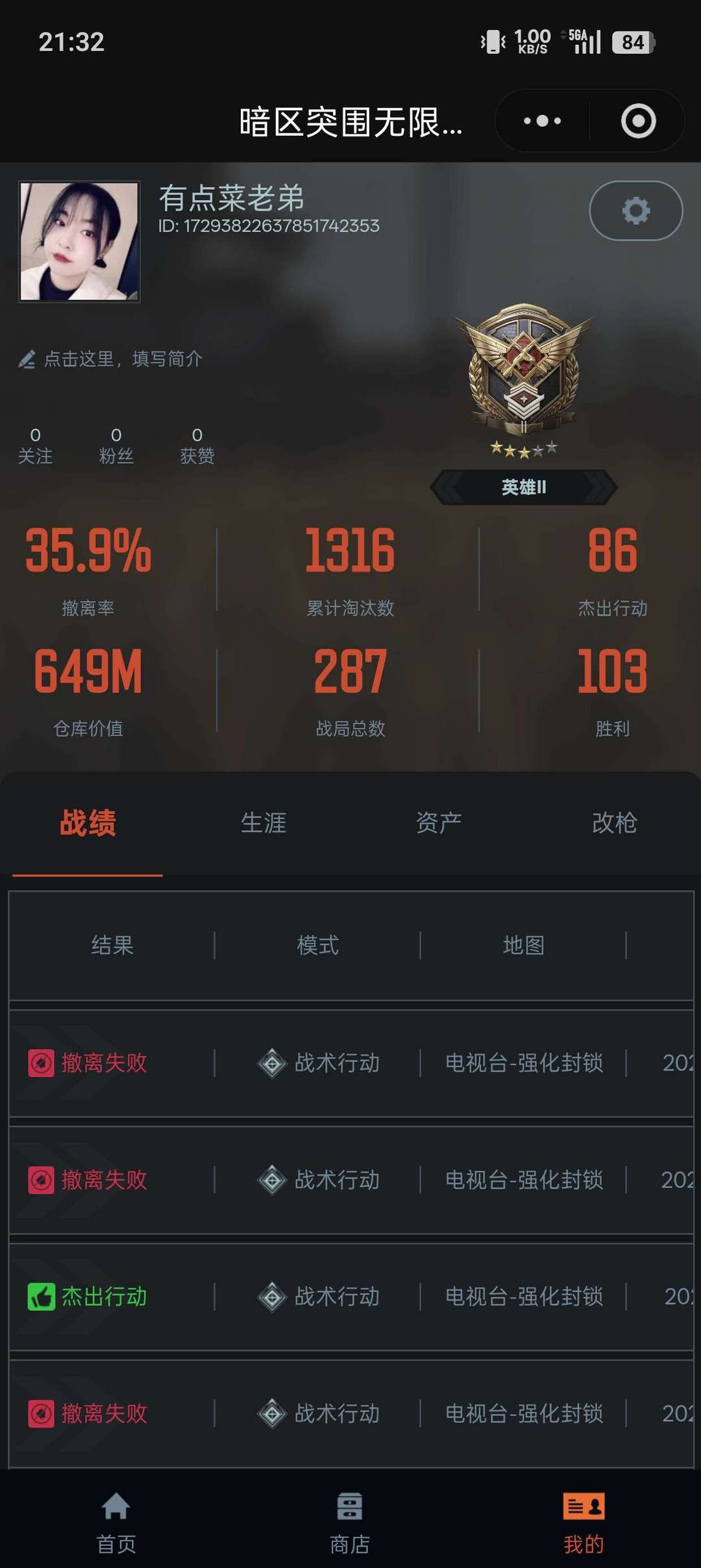 纯币4.7亿,仓库价值649M,9格保险,皮肤有蝴蝶刀、艾薇塔、纯净黎明H4、黄金AK12
