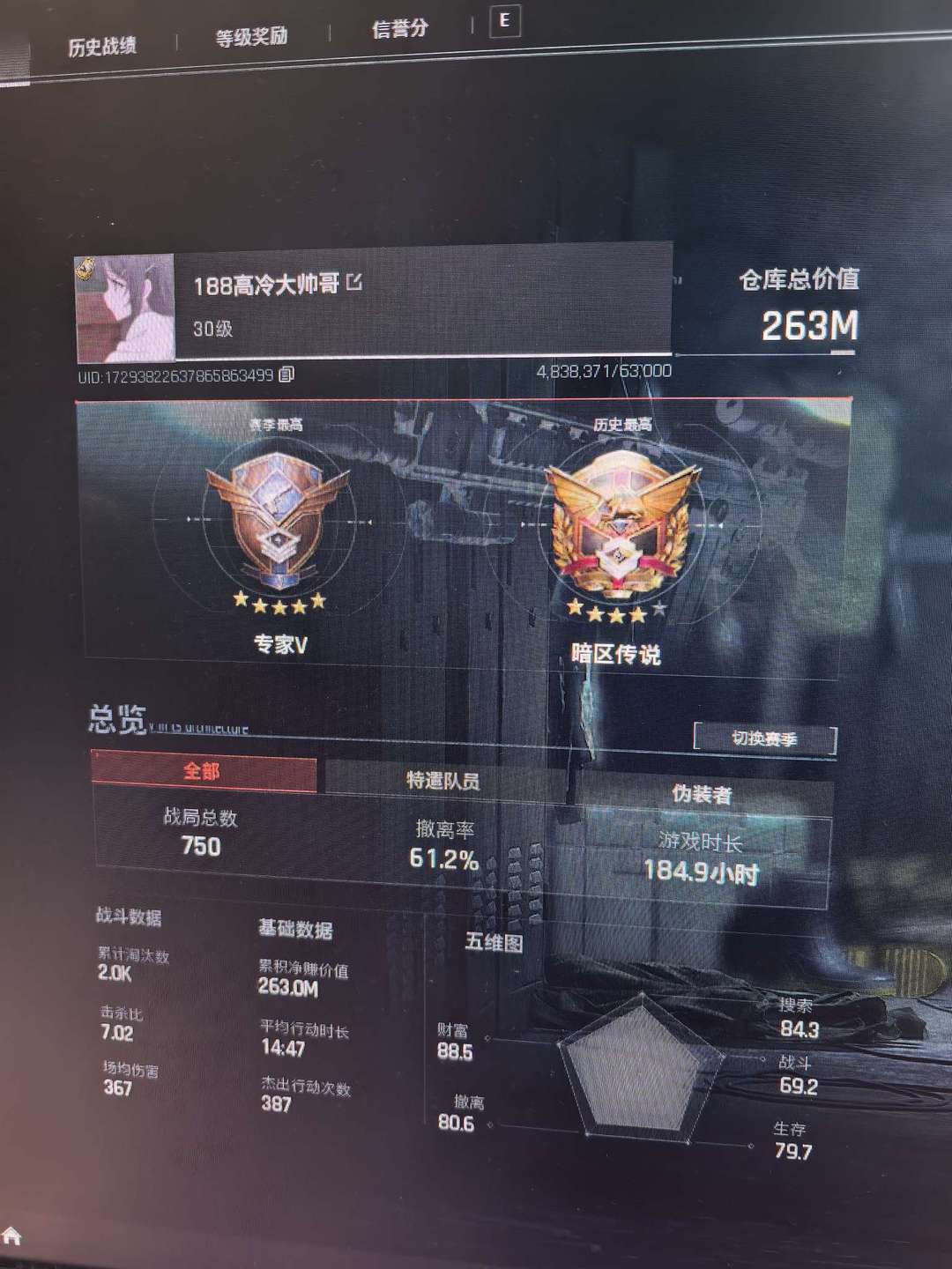 装备描述:【纯币两亿三千万柯恩币】纯币账号,低战斗分,极品账号,很适合护航租来接单,有部分钥匙可以用,欢迎所有玩家来租,勿开挂谢谢