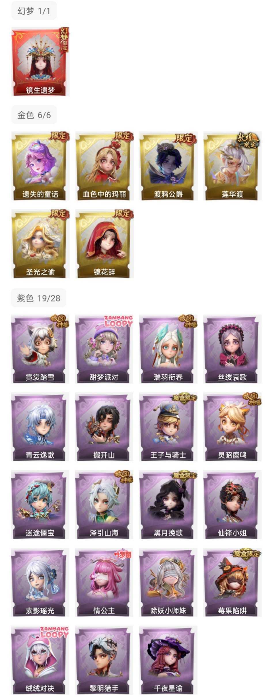 装备描述:【幻梦皮肤】巫铃儿-镜生遗梦 【金色皮肤】零-渡鸦公爵、逍遥-莲华渡、薇薇安-圣光之谕、爱丽丝-血色中的玛丽、小黄-遗失的童话、巫铃儿-镜花辞 【紫色皮肤】艾伦-黎明猎手、兰-千夜星谕、零-搬开山、薇薇安-仙锋小姐、爱丽丝-甜梦派对、艾伦-绒绒对决、莉莉-莓果陷阱、阿念-迷途僵宝、莉莉-除妖小师妹、薇薇安-黑月挽歌、阿念-王子与骑士、莉莉-情公主、逍遥-泽引山海、阿念-灵昭鹿鸣、爱丽丝-瑞羽衔春、小黄-霓裳踏雪、零-青云逸歌、巫铃儿-素影瑶光、爱丽丝-丝缕哀歌 【道具皮肤】喷气背包-晶澜灵翼、黄牛能量饮料-雪顶奇愿、电击枪-甜蜜泡泡枪、腰包-私藏的银河、腰包-惊魂娃娃、桃木剑-永眠曲、铲子-龙鳞、桃木剑-凤鸣九天、腰包-月下莲台、铲子-赞萌波板糖、长鞭-飞天绫、短管猎枪-赞萌露比水枪、黄牛能量饮料-珍珠芭乐莓莓、长鞭-小狗蛇点点鞭、音响-冬夜暖忆、腰包-宝剑八、夜视仪-金丝眼镜、喷气背包-乘风溯雪、转轮手枪-新星时代、传送按钮-幻宠之门、桃木剑-最后的独角兽、急救包-蔷薇物语、音响-鸣沙鼓、音响-happy猫、葫芦-伏妖塔、刺刀-小鲨匕首、传送按钮-昆仑镜、专业手电-云端梦想计划、刺刀