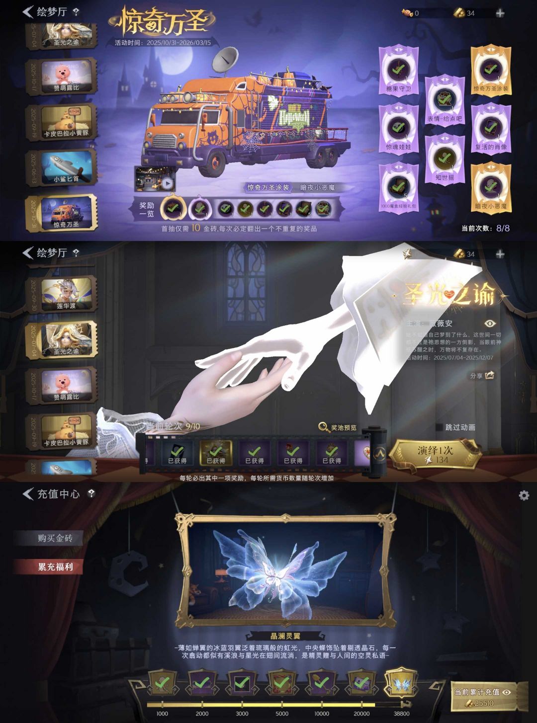 3金15紫24道具✨非遗傩戏✨甜梦派对✨遗失的童话✨圣光之谕✨车皮满抽✨美妆✨镜花辞